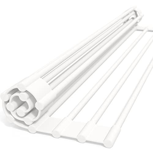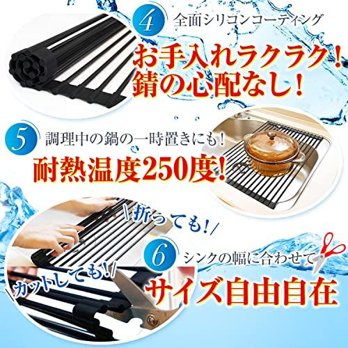 ?【基本仕様】折り畳み式の水切りラックです。小さく丸めてたためる設計でサイズをご自宅のシンクの大きさに合わせられるので、キッチン周りのスペースを有効活用できます。耐荷重18kg, 耐熱250度の特別仕様のため、2人分の皿・カトラリーなど大容量のものを置いても安定・安心です。さらに棒と棒の間を切ることができるので、お好きな幅に調節できます。※シンクの内径が約48cm以内まで対応可能(※お使いのシンクの形状によって内径が異なります、ご購入前に必ずご確認いただきますようお願いいたします) ?【公的試験機関にて食品安全試験合格済】世界最大級の試験機関(SGS)で合格しているため食器や哺乳類を挟んで乾かしても安心。シリコン素材のため汚れにくく、お手入れは洗剤を含ませたスポンジでサッと流すだけで楽チンです。食洗器も使用可能!※お使いの食洗器サイズによっては入らない場合がございます。 ?【様々な使い方を】鍋置きとして、まな板置きとして、またペットボトルを逆さに挟んで速乾性を高めるなど多用途でお使いいただけます。ハサミで切ることでお好みの幅に調整可能なので、洗面所など別の場所でお使いいただくこともでき、ご自身の好みに合わせた使い方が可能です。 ?【しっかり長持ち】重量が約1kgと、安定感のある作りの仕様となっております。またステンレス特有の金属音がせず、水あかもサッと流せるため長い年数お使いいただけます。メーカー保証も1年付いておりますので、ご不明点等ございましたらお気軽にご連絡くださいませ。※お問合せに関しては商品に付属の説明書をご覧ください。 ?【日本人設計・手厚いサポート】弊社では「良い物をリーズナブルに」をコンセプトに商品開発をしております。