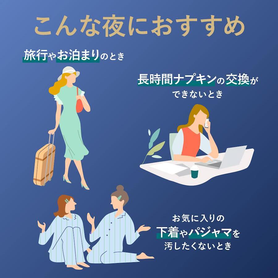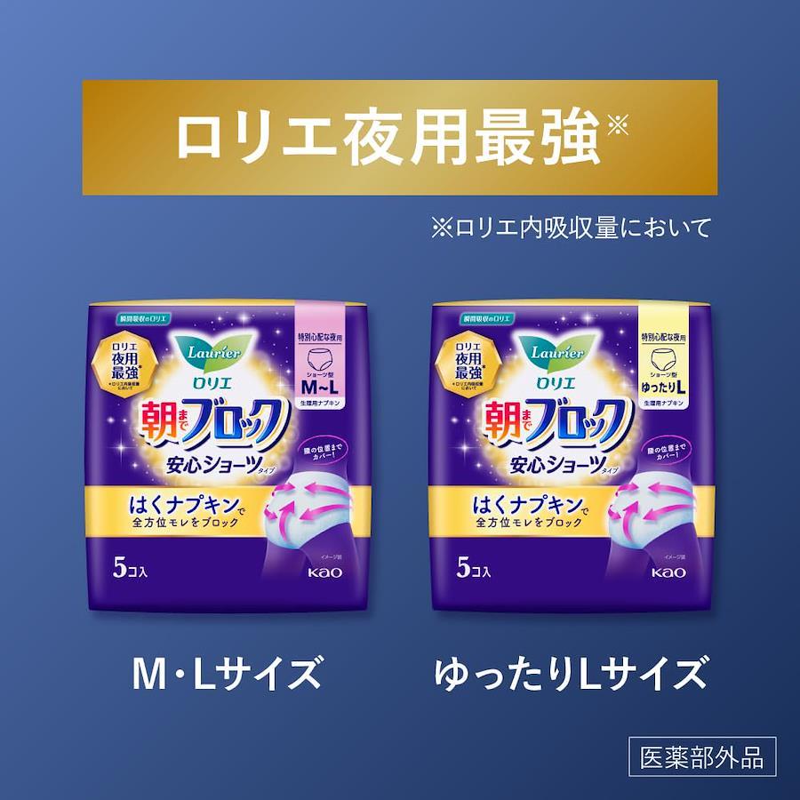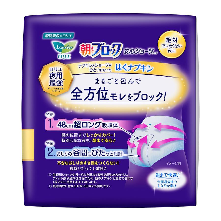 絶対モレたくない夜に ロリエ夜用最強* *ロリエ内吸収量において ナプキンとショーツがひとつになったはくナプキン まるごと包んで全方位モレをブロック! 特長1. 48cm超ロング吸収体 腰の位置までしっかりカバー! 特別心配な夜も、朝まで安心♪ 特長2. おしりの谷間にぴたっと設計 不安なおしりのすき間をつくらない! 寝返りだってし放題♪ ◎ 生理用ショーツやガードルを重ねて使う必要はありません。フィット感や通気性を保つため、他のナプキンと重ねて使わず1枚でのご使用をおすすめします。 ◎ 長時間取り替えられない日中にも便利です。 朝まで快適♪ 全面通気性のしなやか素材 販売名(薬事販売名):ロリエLD-u1 薬事区分:医薬部外品 容量:5コ入×3セット(15コ) 構成材料:表面材:ポリエチレン・ポリエステル 色調:白 ピンク(赤色405号を含む)廃棄テープに青色404号を含む 製造販売業者:花王株式会社
