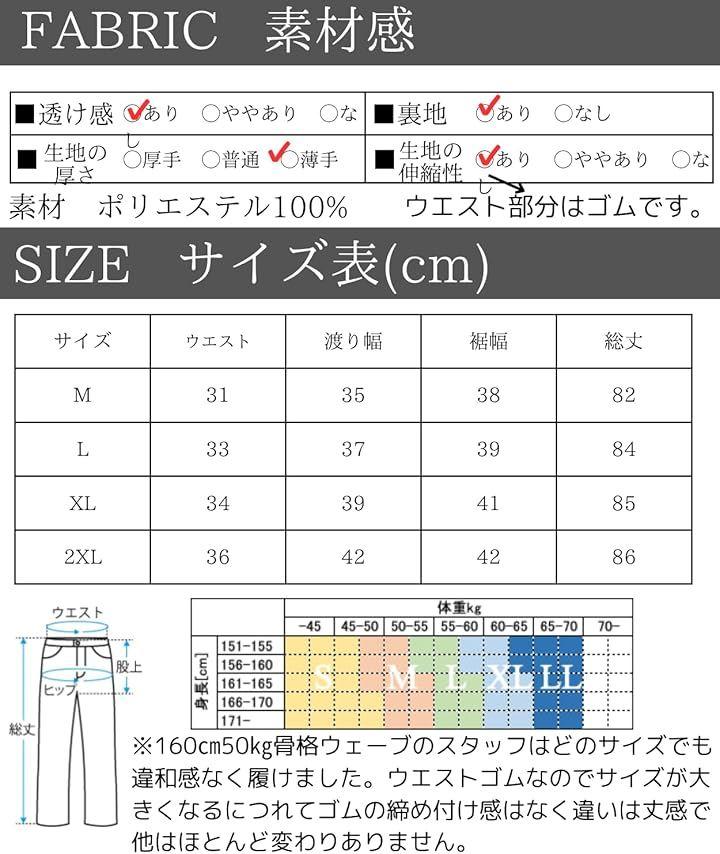 「素材」ポリエステル100% 「カラー」ホワイト、ピンク、ブルー、ブラック「サイズ(cm)」M ウエスト31/渡り幅35/裾幅38/着丈82/股上34/股下48 L ウエスト33/渡り幅37/裾幅39/着丈84/股上35/股下49 XL ウエスト34/渡り幅39/裾幅41/着丈85/股上36/股下50 2XL ウエスト36/渡り幅42/裾幅42/着丈86/股上36/股下50