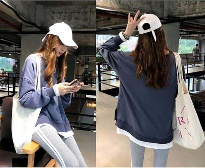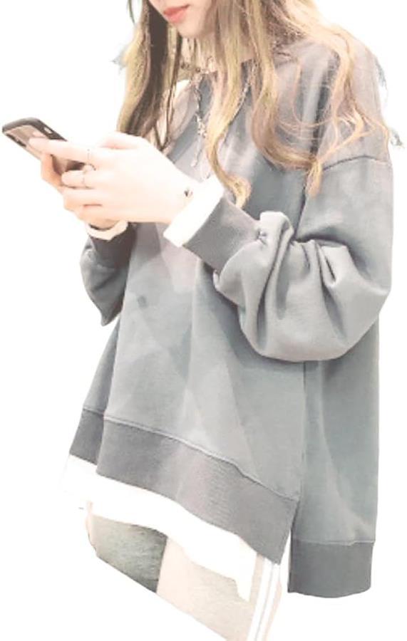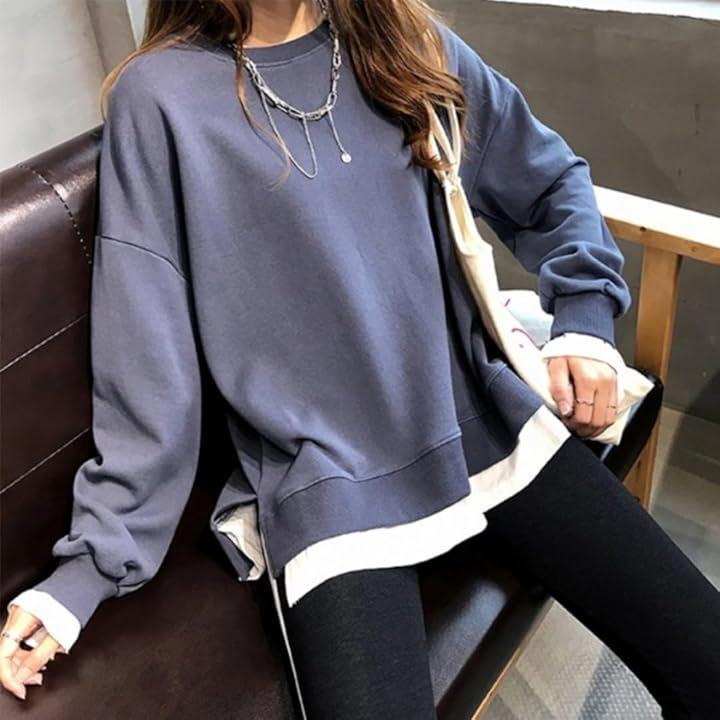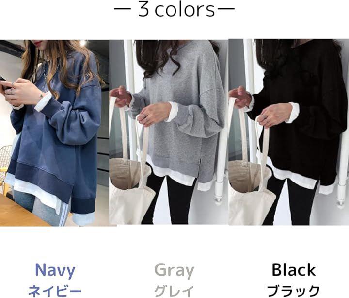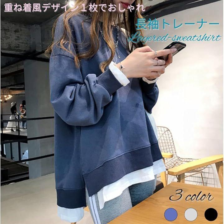 「重ね着風デザインで1枚でおしゃれ」 裾と袖口にレイヤード風の切り替えが入った“重ね着しているように見える”トレーナー。