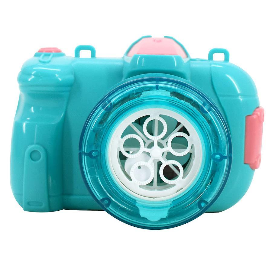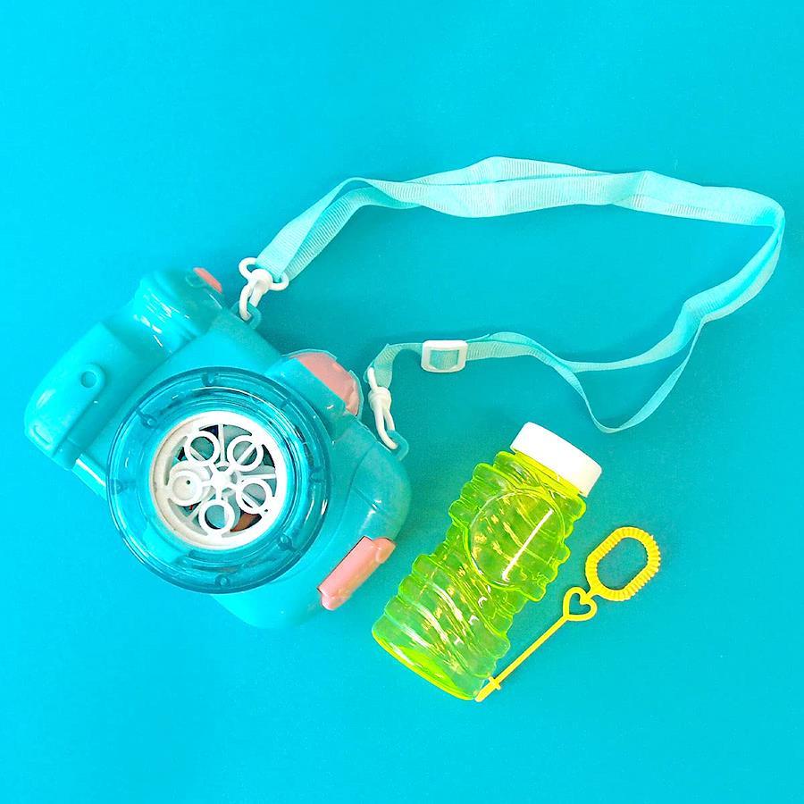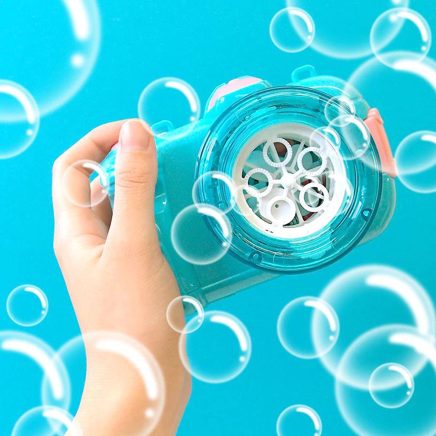 *カメラではありません!光る! カメラ型のシャボン玉マシーン!シャッターボタンをポチッと押すと、シャボン玉がたくさん飛び出します。大量バブルで、気分はマーメイド!? まさにバブルシャワー♪便利なネックストラップ、希釈タイプのシャボン玉液付き!