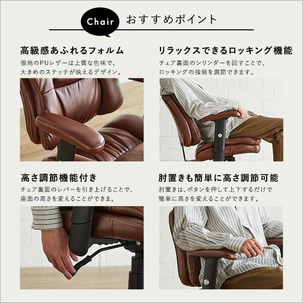 【素材】(チェア)張地:合成皮革(PU)内部:積層合板、ウレタンフォーム脚部:硬質ナイロン(テーブル)MDF、スチール【商品サイズ】チェア:W65×D67×H84.5-93.5 (SH43-52)cmテーブル:W110cm×D60cm×H83.5cm【商品重量】チェア:12kgテーブル:10kg【梱包サイズ】チェア:W62×D31×H60cmテーブル:112x71.5x6.5cm【梱包重量】チェア:14?テーブル:17?【生産国】中国【カラー】SH-LBR,WA-LBR【その他】組み立て時間45分>>ロッキング機能付きレザー調デスクチェア(単品)はこちら >>ヴィンテージ風L字パソコンデスク(単品)はこちら