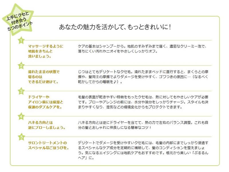 クリーミーなコクのある泡でやさしく地肌と髪を洗い上げ、根元から素直な髪に整えます。くせのある髪にうるおいとツヤをチャージし、髪質を内部から整え扱いやすくします。■グリーンナッツオイル(プルケネチアボルビリス種子油)配合■シリコーンフリー