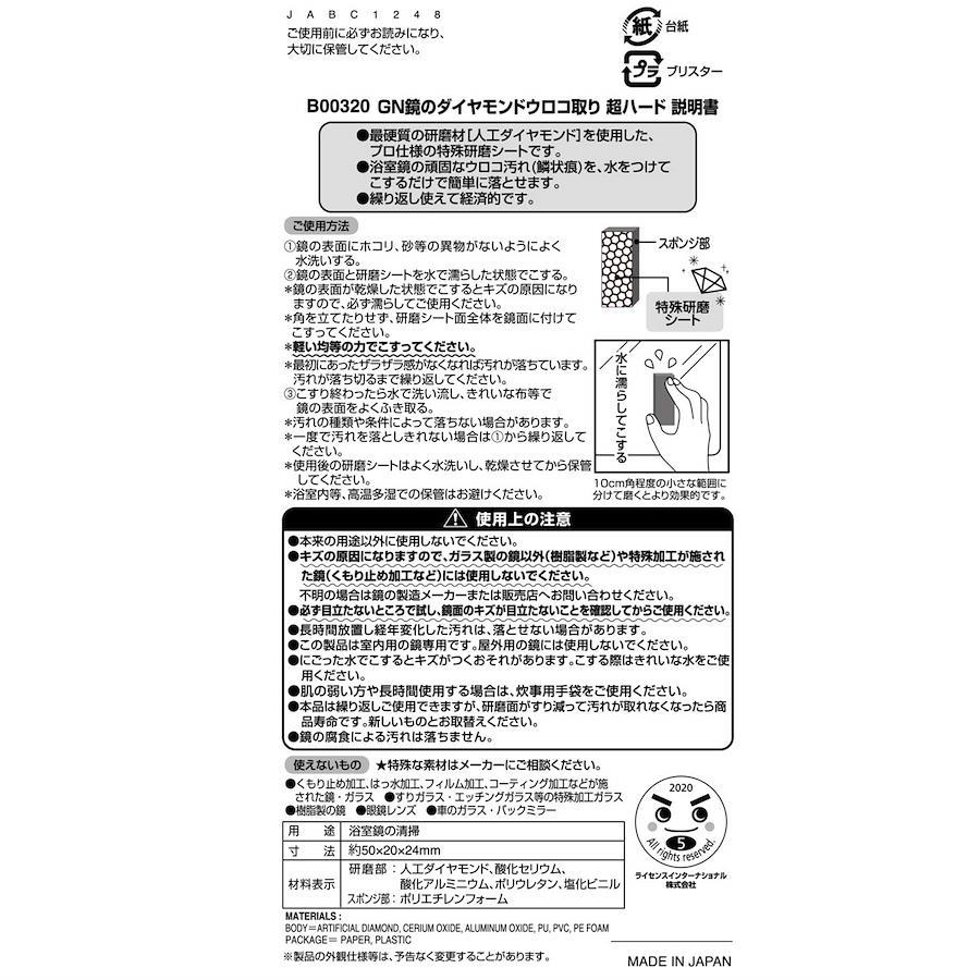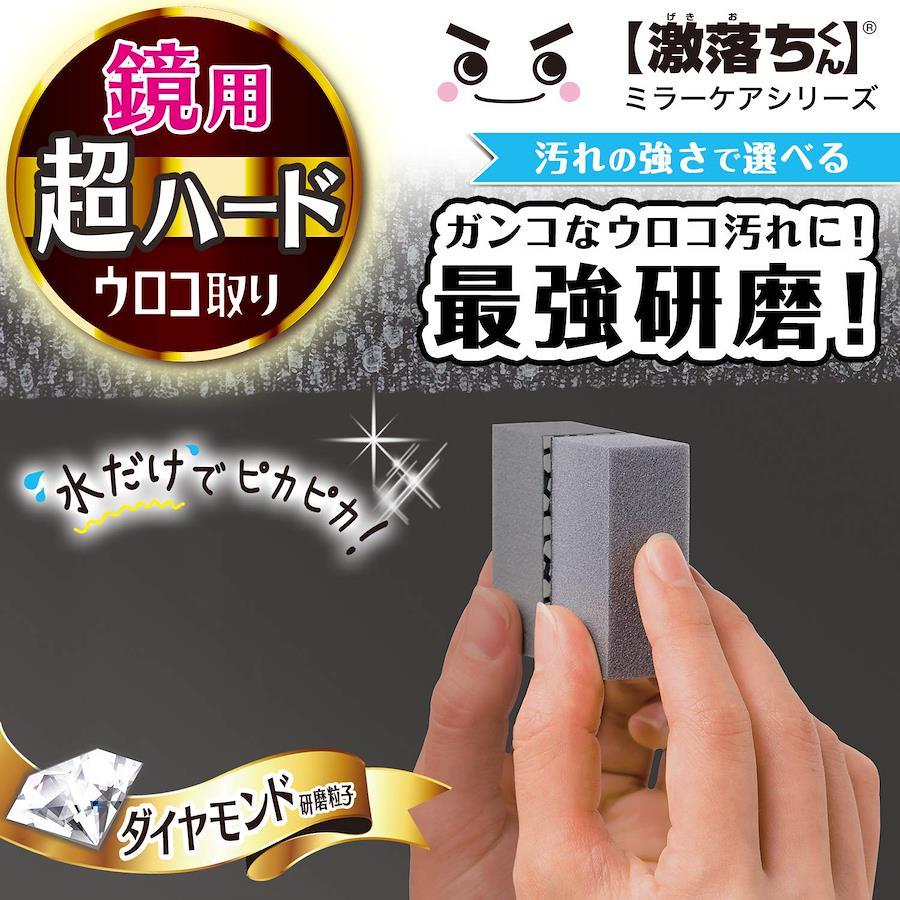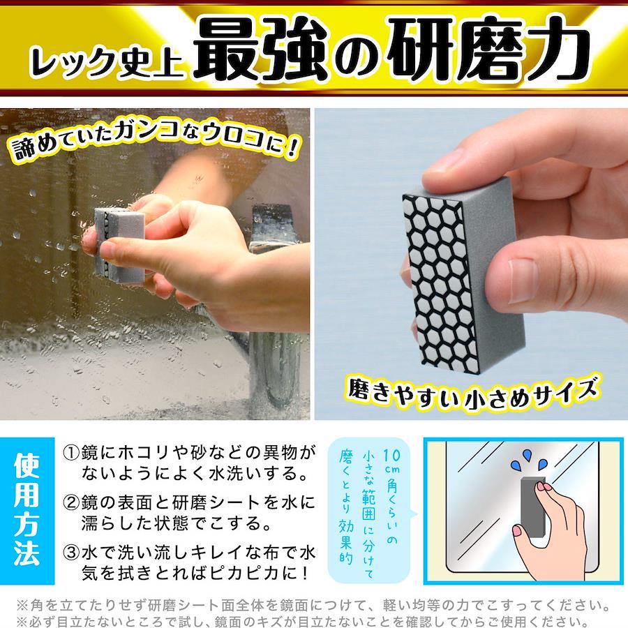 ●ダイヤモンド研磨粒子を20%増量!レック史上最強の研磨力を持った、激落ちくんのウロコ汚れ落とし!●最硬質の研磨材「人工ダイヤモンド」を使用した、プロ仕様の特殊研磨スポンジ。●浴室鏡のガンコなウロコ汚れ(鱗状痕)を、水をつけてこするだけで簡単に落とします!●くり返し使えるので経済的です。
