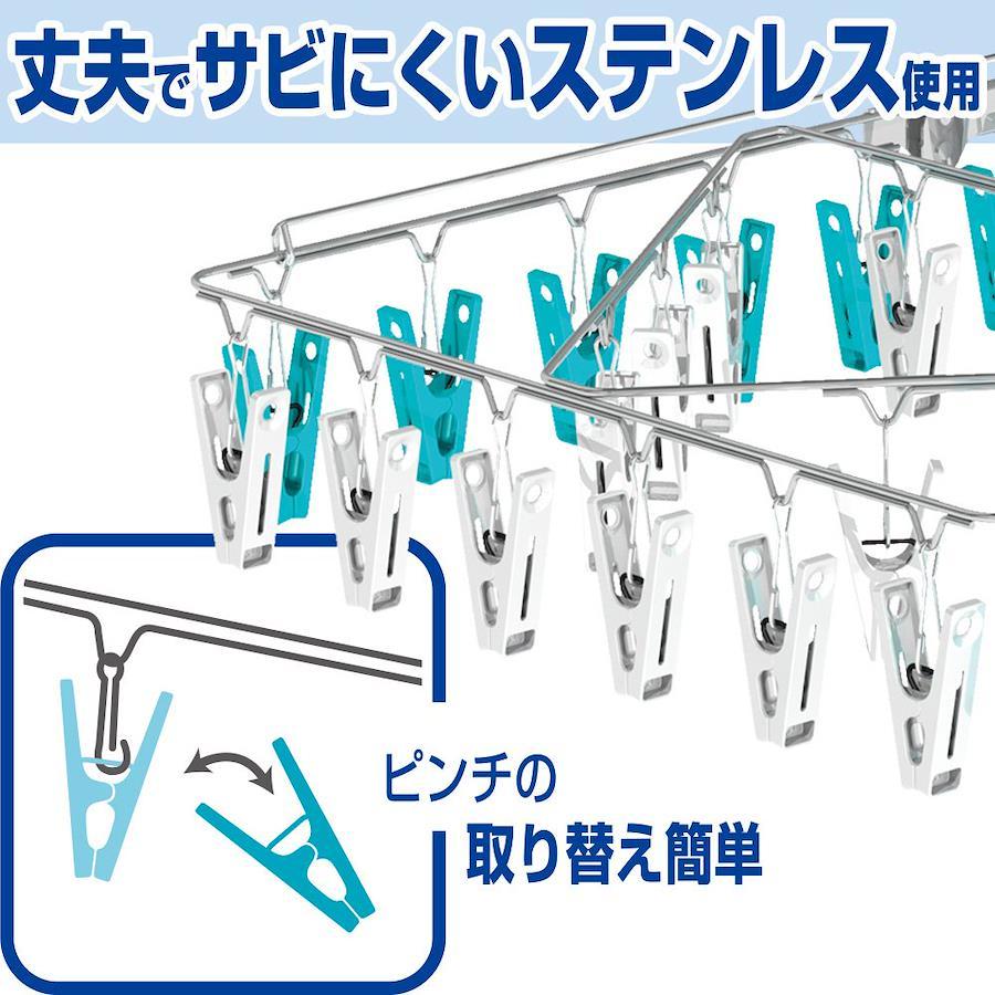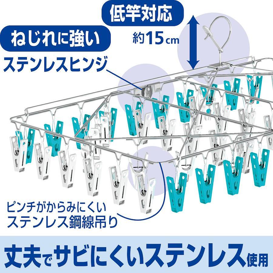 材質 本体・ワイヤー・フック=ステンレス鋼線、受け台・ヒンジ・ワッシャー=ステンレス鋼板、ピンチ=ポリプロピレン、竿ストッパー=シリコーン樹脂