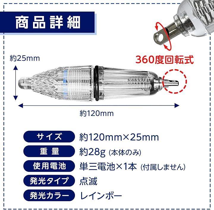 商品詳細」サイズ(約):120mmx25mm /重量(約):28g(本体のみ) /使用電池:単三電池x1本(付属しません) /発光タイプ:点滅 /発光カラー:レインボー /対象魚:イカ/太刀魚/メバル/アイナメ/キンキ/カレイ/アコウなど夜釣りに適した魚類