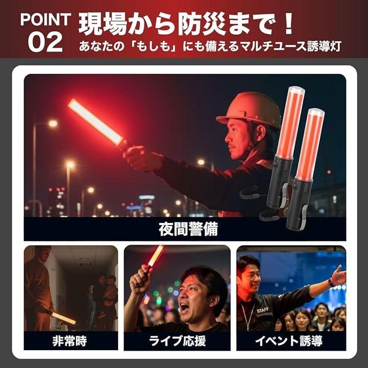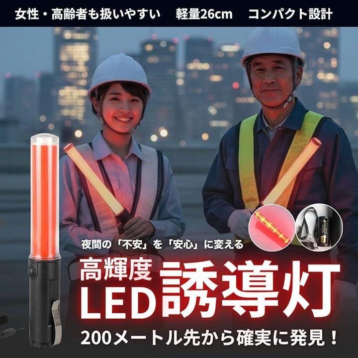 「高輝度LEDで夜間もはっきり見える。抜群の視認性」 高輝度LEDを採用した誘導灯は、暗闇や悪天候でもしっかりと視認でき、夜間の交通整理や工事現場での誘導作業に最適です。