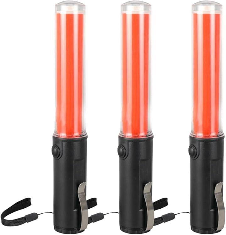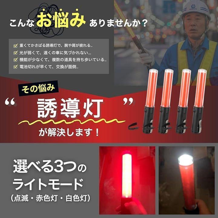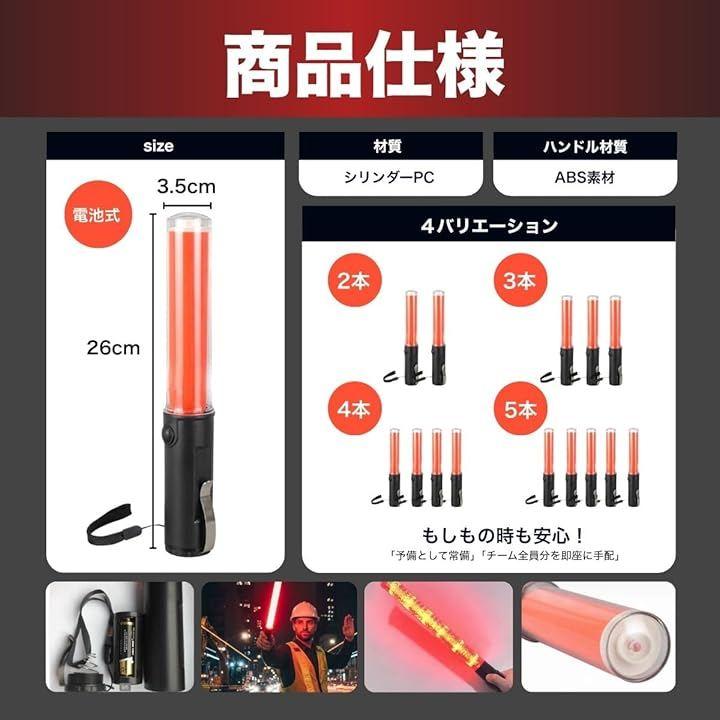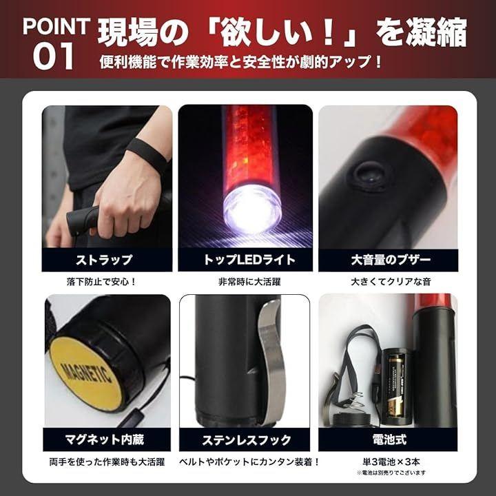 「商品詳細」 <セット内容>:2本セット・3本セット<サイズ>:全長26cm x 直径3.5cm<ライトモード>:点滅/赤色灯/白色灯<仕様>:高輝度LED、ストラップ付き、大音量ブザー搭載、マグネット内蔵、ステンレスフック付き<電源>:単三電池3本(別売)<用途>:交通整理、工事現場、夜間警備、避難誘導、アウトドア、車載用、非常用ライトとして幅広く活躍します。