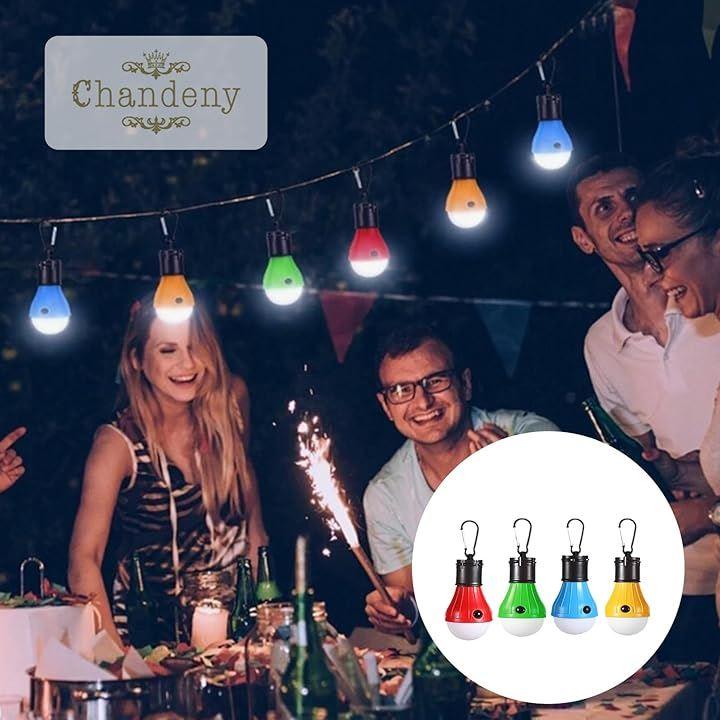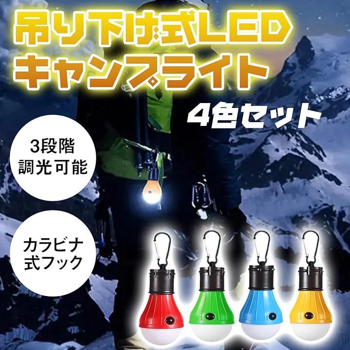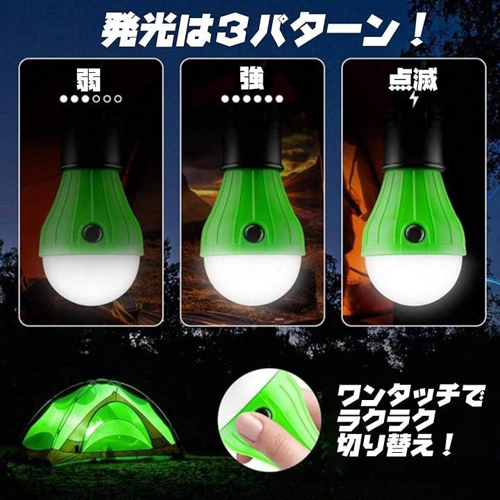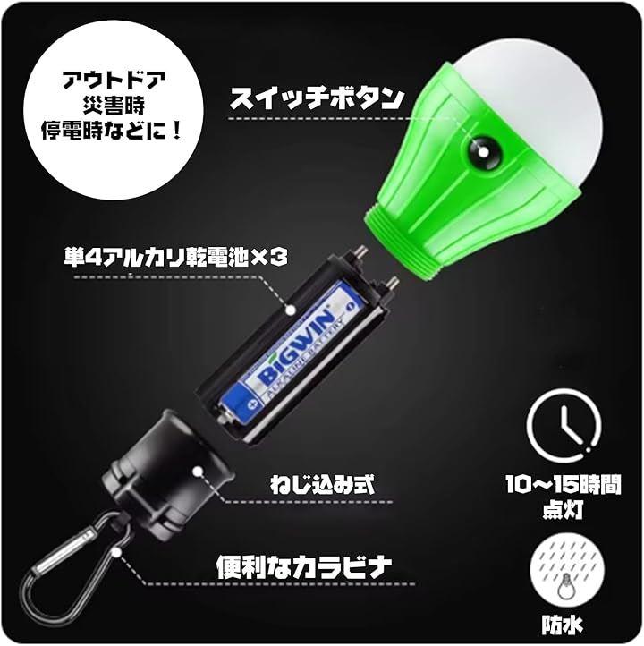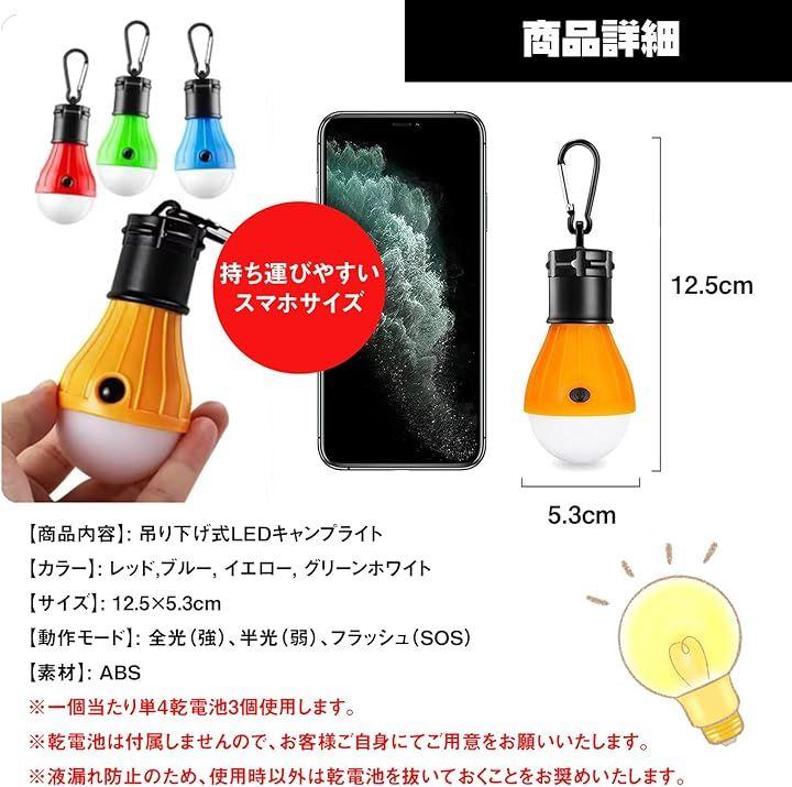 「多機能LEDランタンでアウトドアを満喫」 吊り下げ式の電球型小型LEDランタン。