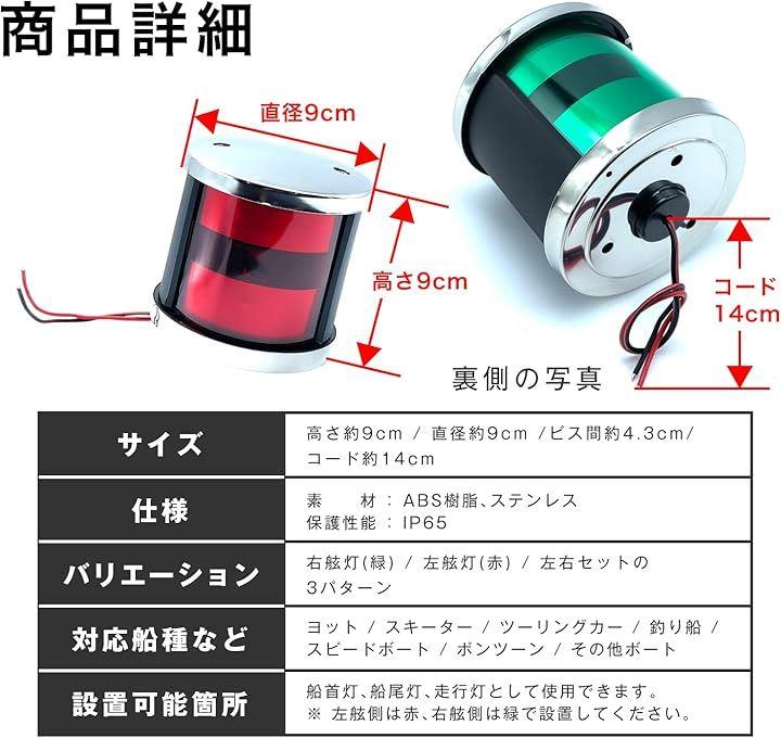 「仕様」 電圧…DC12/24V兼用 / 高さ約9cm / 直径約9cm / ビス間約4.3cm / コード約14cm 「バリエーション」左舷灯(赤) / 右舷灯(緑) / 左右セット の3種類をご用意しております。