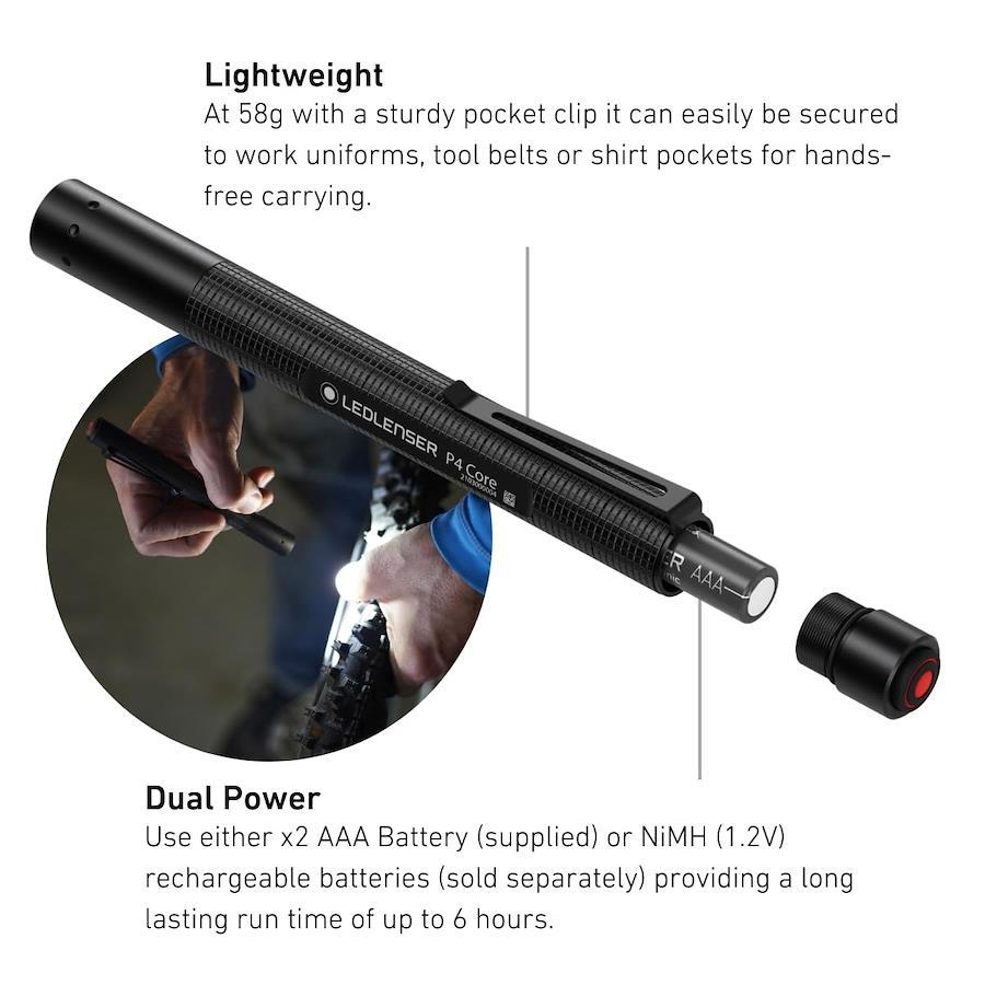 ●単4型アルカリ電池×2本使用のスタンダードペンライトです。●アドバンスフォーカス機能を搭載しています。●クリップ付属で腕ポケットなどに収納可能です。【光束(lm)】パワー:120 / ミドルパワー:60 / ローパワー:15【照射距離(m)】パワー:90 / ミドルパワー:55 / ローパワー:25【点灯時間(h)】パワー:5 / ミドルパワー:9 / ローパワー:20【使用電池】単4アルカリ電池×2本【本体寸法(mm)】?15×146 【本体質量(g)】約58(電池含)