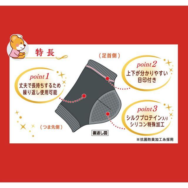 商品紹介シルクプロテイン入りシリコン特殊加工のシリコンラップ効果(実用新案取得済)でしっとり・つるつるなかかとにします。生地が薄手なので、靴下などを重ね履きしてもモタつきません。指も動かせムレにくい、快適な履き心地のオープントゥタイプ。上下が分かりやすい工夫をしています(足首側に解り易くピンクの目印をつけています)。何度も繰り返し洗濯して使えるので、清潔に使用できます。ご注意使用上の注意:お肌に合わないときは、ご使用をおやめください。使用方法足に装着し、必要な時間(指定なし)を経過させた後、取り外して洗い直してください。