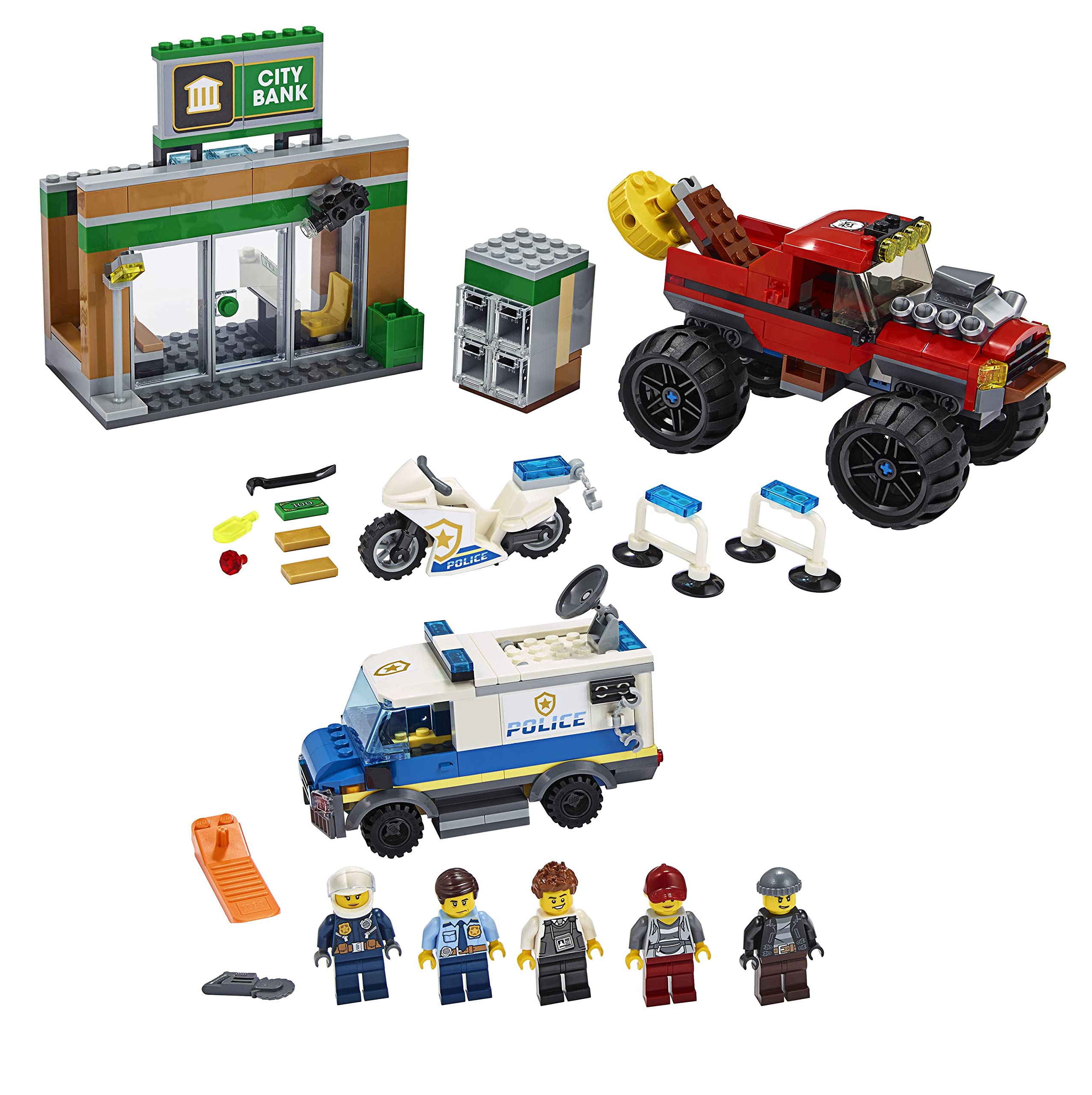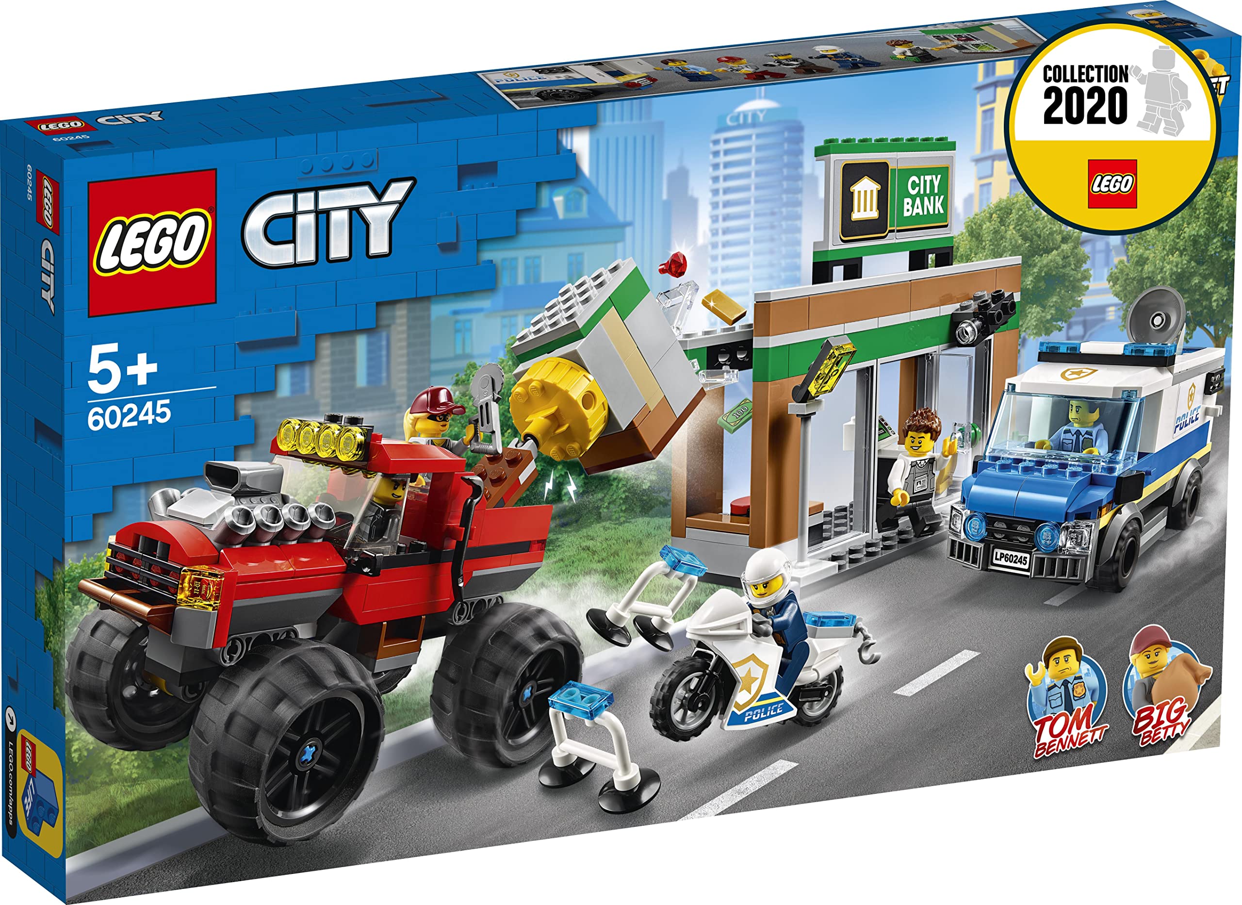 ギミックが楽しい、レゴシティ ポリス モンスタートラック強盗(60245)は、磁気アーム付きモンスタートラック、ミニフィギュア2体などが入ったセットです。多彩なアクションがキミの部屋で楽しめます。磁気アーム付きモンスタートラック、磁気金庫付き銀行、警察の監視用ワゴンとオートバイ、ミニフィギュアが入った組み立てセットです。警察の監視用ワゴンや銀行の建物は、インテリアの細部までこだわり、銀行の金庫はモンスタートラックのアームで壁から引っ張り出せます。他のセットと組み合わせれば、遊びの世界が広がります。このアクション満載の組み立てセットは、クリスマスやお誕生日に限らず、乗りものやアクション遊びが大好きなお子さまへのギフトにもぴったりです(対象年齢:5才以上)。モンスタートラックのサイズは、高さ約8cmx長さ約17cmx幅約9cm。警察の監視用ワゴンのサイズは、高さ約8cmx長さ約12cmx幅約6cm。電池は不要です。お子さまの想像力がエネルギー。電池を使わない玩具は、批判的思考と問題解決の能力を高め、「自分でできる」満足感を与えます。レゴのセットには、分かりやすい組み立て≪新品未開封品≫書が付いています。このセットではさらに、ステキな体験ができます。レゴライフアプリ(無料)をダウンロードし、Instructions PLUSを使えば、ズームや回転ツールを使って組み立て方を確認することができます。レゴシティシリーズは、想像力が広がるごっこ遊びを引き出す、機能満載の建物やカッコいい乗りもの、楽しいキャラクターたちがいっぱいです。ふだんの生活の延長にあるような世界を、縦横無尽に駆けまわるストーリーを自由に創作できます。1958年の創業以来、レゴの玩具は業界基準を満たし、品質にむらがなく、別のセットと組み合わせても、簡単に組み立てや取り外しができます。世界品質基準を満たすだけでなく、レゴグループは、レゴブロックやパーツの入念な品質検査(落下、圧縮、ねじり、加熱、曲げ、キズ、引張の各種試験)を実施しています。