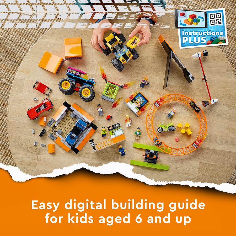 レゴシティスタントショーアリーナでは2つのモンスタートラック自動車2台、収納式のルーフ付きの2台のくるま、火の輪、スタントバイクで迫力のシーンを再現できます。滑走路、フライホイール動力付きの自走式バイク、ホットドッグスタンド、レゴスタントレーサー勝者に与えられる黄金カップが備え付けられた表彰台が付属しています。レゴミニフィギュア7体付き。レゴシティTVキャラクターが3体付いており、お友達と一緒に組み立てて何時間でも遊べます。バイクを手で押してフライホイールを発動させ、火の輪をくぐって発進。バックフリップを披露して、セットをアレンジして新たなパフォーマンスを繰り広げよう。スタントショーアリーナ(668ピース入り)はLレゴシティスタントのサブテーマで、最高のディスプレイとショーを演出できます。乗り物 のりもの が好きな 6歳以上 の 男の子 女の子 におすすめのおもちゃ
