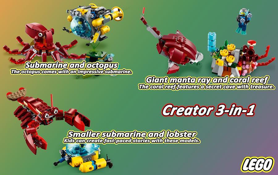 8歳以上のお子様は、素晴らしいレゴクリエイター3in1サンケントレジャーミッション(31130)でスリリングな水中アドベンチャーを楽しむことができます。 無限の遊びの可能性 - 子供たちはタコと潜水艦、巨大なロブスターと小さな潜水艦、または巨大なマンタ、ダイバー、サンゴ礁で物語をプレイすることができます。機能が満載。潜水艦にはコックピット、カメラ、プロペラ、カーゴハッチがあります。 小型の潜水艦にはコックピットとプロペラがあり、サンゴ礁には秘密の洞窟があります。外出先で遊べます。寸法は3インチ以上です。 高さ8cm、4.5インチ。 長さ12cm、4インチ。 幅10 cmの潜水艦のおもちゃは、お子様がどこにでも持ち運べるポータブルサイズです。 すべてのレゴセットは、子供の安全基準を満たすために厳格にテストされています。