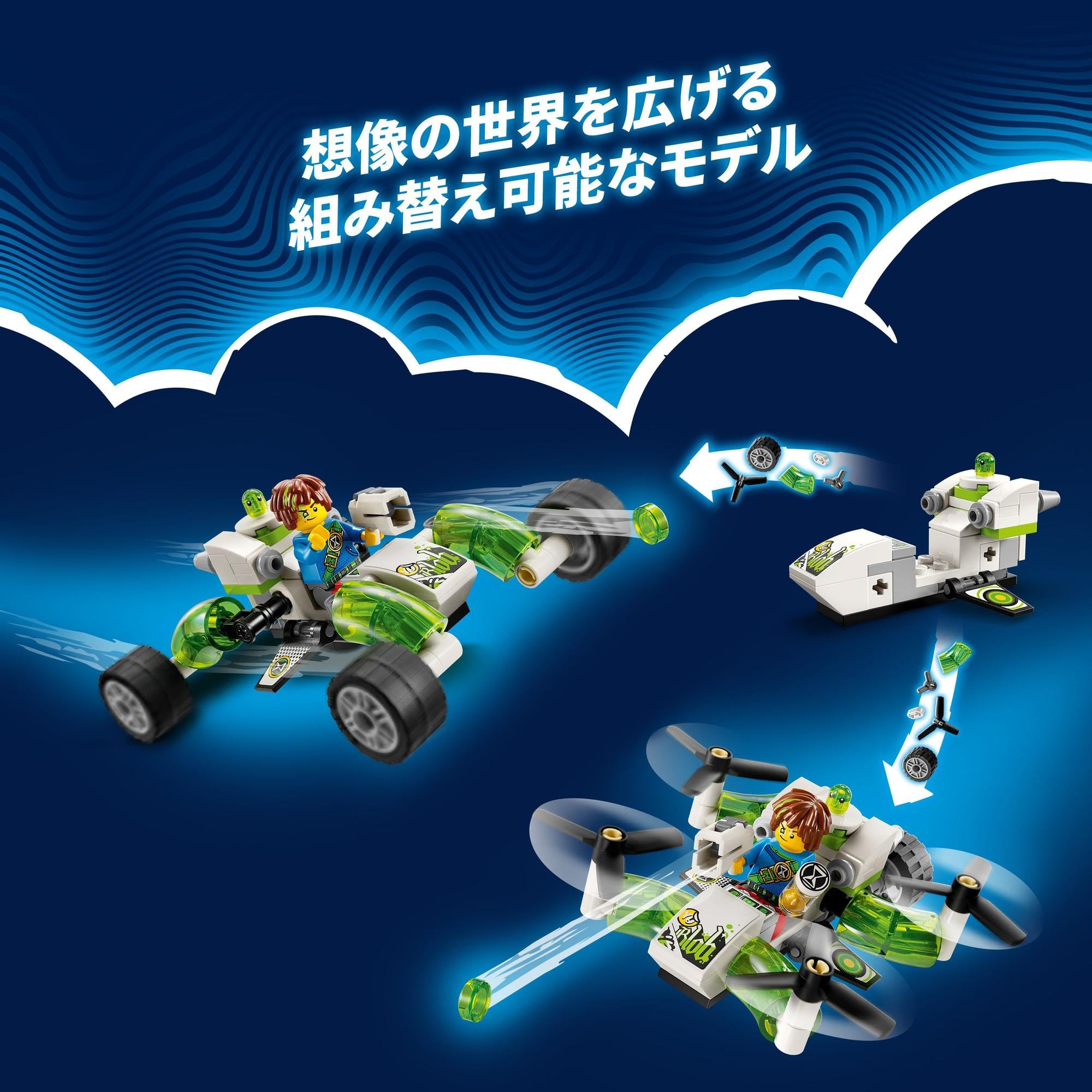 組み立てと組み替えが自由自在 - 車輪が回転し、どんなデコボコ道もへっちゃらなバギーか、パワフルなリアエンジンが付いたマルチコプターを組み立てられます