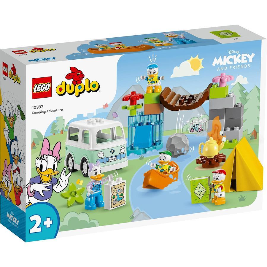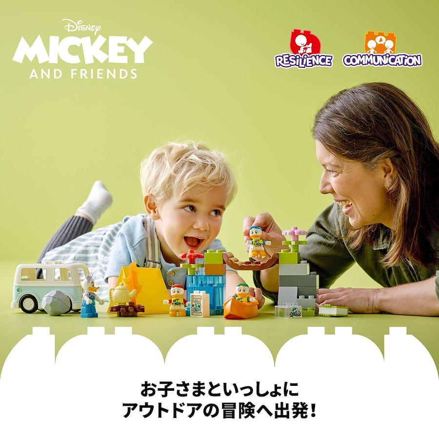 レゴ(R)デュプロ(R) ? ディズニー ミッキー&フレンズ キャンプホリデー(10997)は、遊びを通して楽しく学べる知育玩具です。キャンプ場でいろいろなことにチャレンジするデイジーダックとその甥っ子たちが、ねばり強さやチームワークの大切さを教えてくれます。(対象年齢:2才以上) 創造力を育てる組み立てプレイセット キャンピングカーでアウトドアの冒険に出発したデイジーダックと三つ子のヒューイ、デューイ、ルーイ。キャンプ場で見つけた宝の地図を頼りにカヌーで川下りを始めます。今にも落ちそうな大きい岩がのったユラユラ揺れる橋の下を通り抜けて、やっとたどり着いたブロック製の滝の裏で宝物を発見!キャンプ場に戻ったら、たき火を起こしてテントの中でゆっくりしましょう。 ライフスキルが身につく 手先を器用に動かすスキルを発達させる知育玩具です。また、ご家族といっしょにおままごとをしながら、思いやりの気持ちや自己表現・協調性を身につけていくお子さまの段階的な成長を見守ることができます。