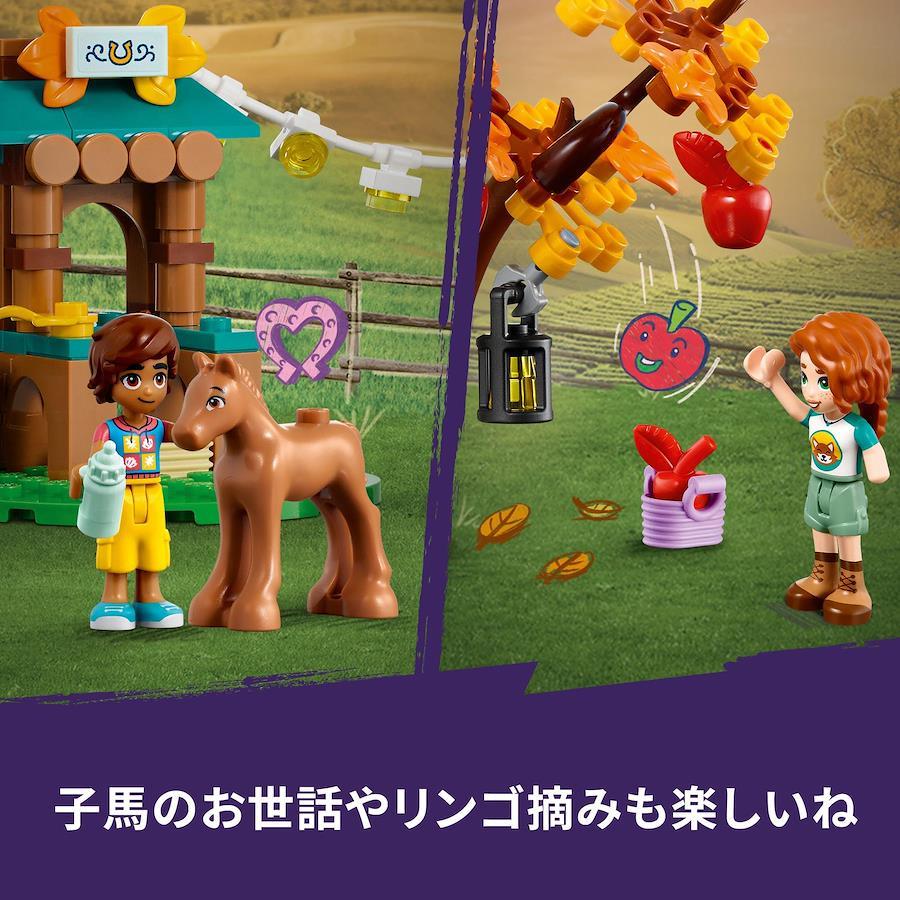 ミニドールフィギュアとアクセサリー - レゴフレンズのミニドールフィギュア(オータム、レオ、アリヤ、ママのミア)、動物フィギュア(イヌのデイジー、子馬)のほかに、たくさんのアクセサリーが付属しています。