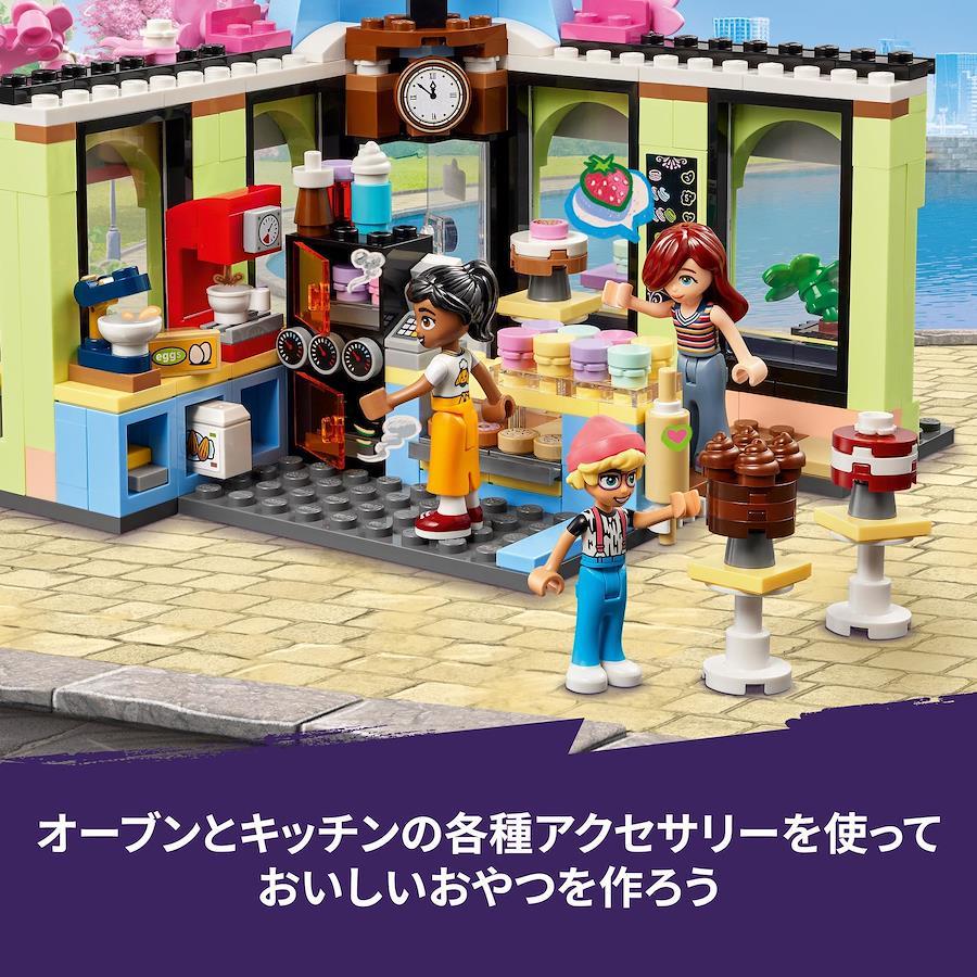カフェごっこをしよう - カフェの建物、ミニドールフィギュア3体、犬のどうぶつフィギュア1体、食品関連の各種アクセサリー、スクーターが物語づくりに役立ちますケーキ屋さんで働こう - お子さまは、オーブンやキッチンの各種アクセサリーを使って、ベアトリスさんのお手伝いに大忙しミニドールフィギュアとどうぶつフィギュア - カフェにやって来たペイズリーとオリーは何をするのかなお子さまは様々な物語を創作していきます各種アクセサリー - マカロン、クロワッサン、スクーターとヘルメット、配達ボックス、ペットフードのボウル、トロフィー、ホウキなど、役立つアクセサリーがいっぱいですごっこ遊びが大好きなお子さまへ - レゴフレンズの世界でカフェオーナーになれる組み立てセットが、お子さまのお祝いに花を添えますレゴフレンズシリーズ - この他にも、日常にありがちな冒険ごっこを通して、多彩なキャラクターを演じられる組み立てセットが揃っています(各セット別売)サイズ - (約)高さ11cm x 幅15cm x 奥行19cm/ピース数:426街づくり が好きな 5歳 6歳 7歳 8歳 小学生 男の子 女の子 向けのおもちゃ【免責事項】メーカーによる商品リニューアルに伴いパッケージ(内容量も含む)変更が行われた場合、新パッケージでお届け致します事ご了承願います。