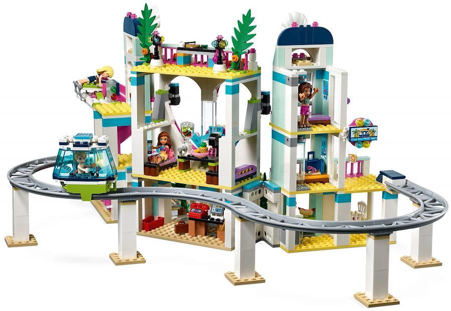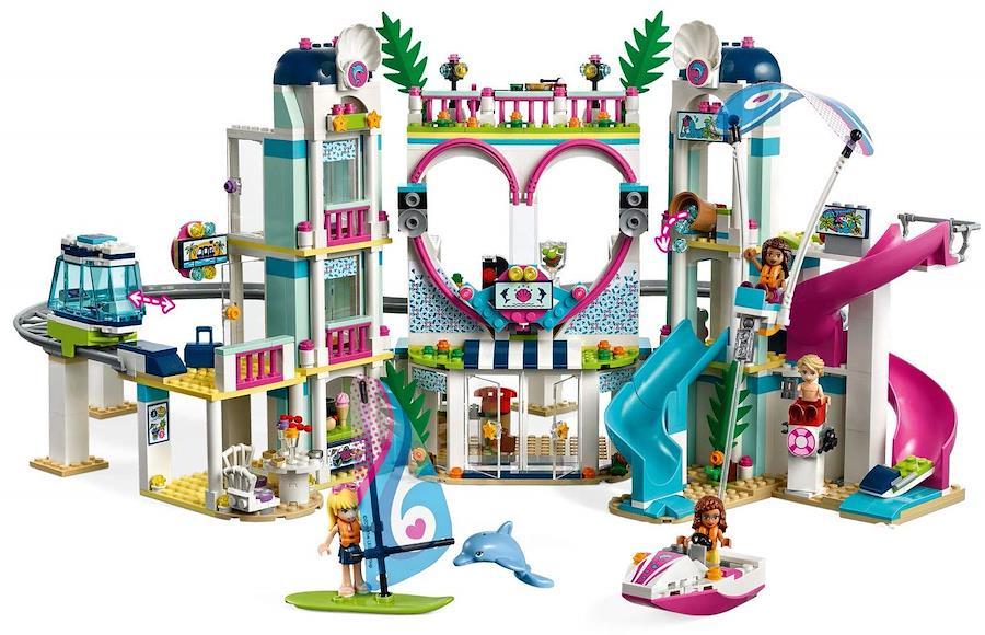 ステファニー、アンドリア、オリビア、メイスン、イルカのシーンのミニフィグ付きビーチウォーターパークまで行くモノレール付きリゾートホテル電話とコンピューターが置かれたロビー、ブレンダーのあるジュースバー、DJデッキ付きルーフテラス、レストラン、2つの部屋が付いたリゾートホテル2つの滑り台、傾けると水が溢れるバケツ、取り外し可能なパレセーラー付きウォータースクーター、ウィンドサーフィンボード、ライフガードスタンド、更衣室が付いたウォーターパーク付属品に含まれるのは、スーツケース、鍵、ホットドッグ、アイスクリーム、フルーツ、カップ、ボール、トランシーバーロビーに行って部屋の鍵を受け取り、ジュースバーで飲み物を飲もう。モノレールに乗ってビーチウォーターパークに行き、スライドやその他のウォータースポーツに挑戦しよう。 人懐こいイルカを見つけよう。日が暮れたら、レゴフレンドセットの仲間と一緒にホテルの屋上パーティでダンスをして過ごそう。ハートレイクシティ リゾートは、高さ約26センチ、幅51センチ、奥行き29センチモノレールカーは、高さ約7センチ、長さ6センチ、幅3センチ