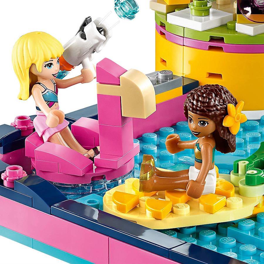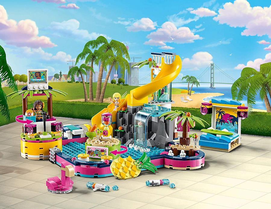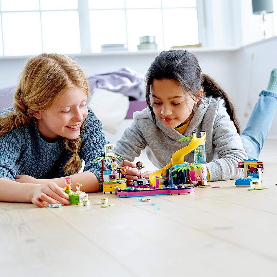 想像力をかき立てるプールセット! 滑り台、滝、ウェーブマシーン、ジュースバーにDJブースまで、お友達と最高のごっこ遊びを楽しもう。レゴフレンズのミニフィグ2体(アンドレア、ステファニー)付き。468ピース|対象年齢6歳以上。あらゆる年齢のお子様から大人まで楽しめます。その他すべてのレゴ製品と組み合わせてお楽しみいただけます。