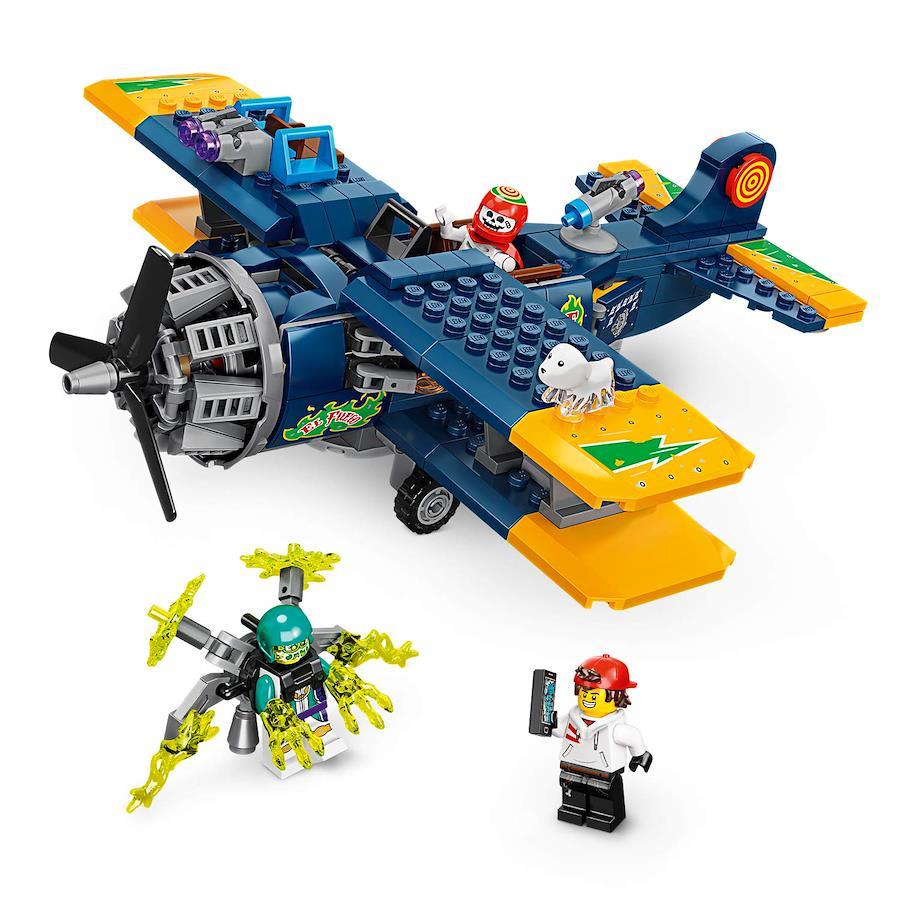 カッコいいスタント飛行機のセットには、ジャック、ガイコツのエル・フエゴ、メアリー・ブレイクサムの3体のミニフィグ、ゴースト犬スペンサーのフィギュアが付属しています。