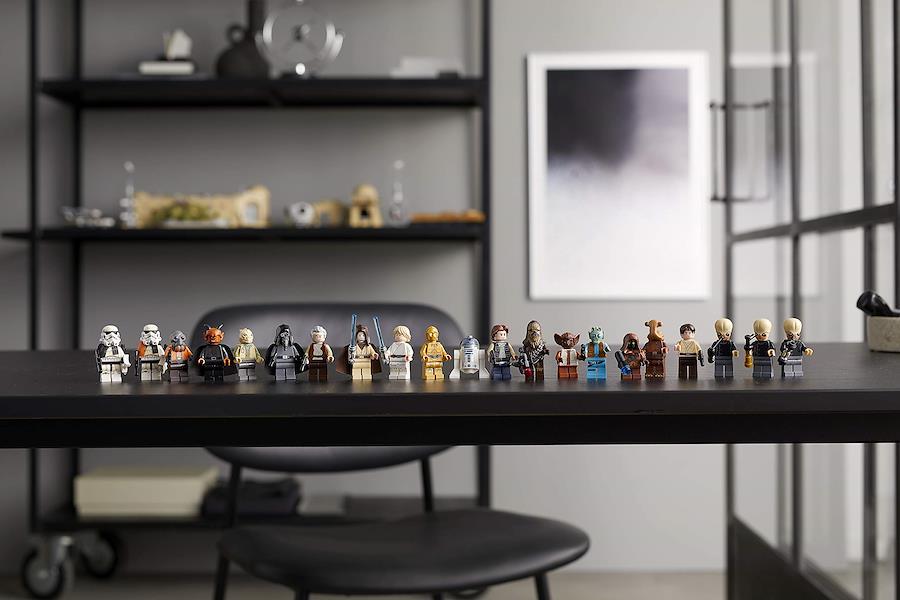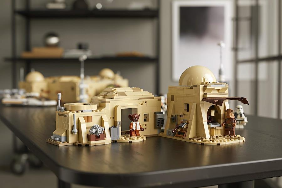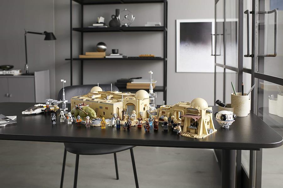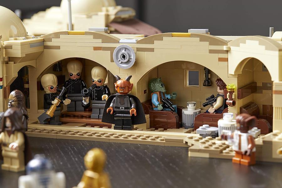 ルーク・スカイウォーカー、ハン・ソロ、チューバッカ、オビ=ワン・ケノービ、C-3PO、ポンダ・バーバ、ガリンダン、ラブリアをはじめとするミニフィグ21体、R2-D2ドロイドフィギュア、デューバックのフィギュアが集まるタトゥイーンの酒場は大にぎわい!