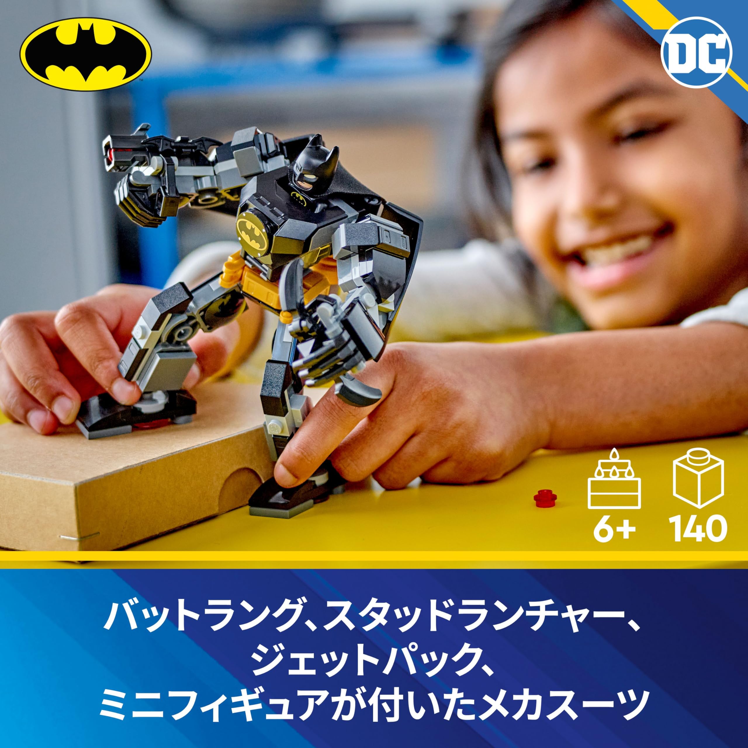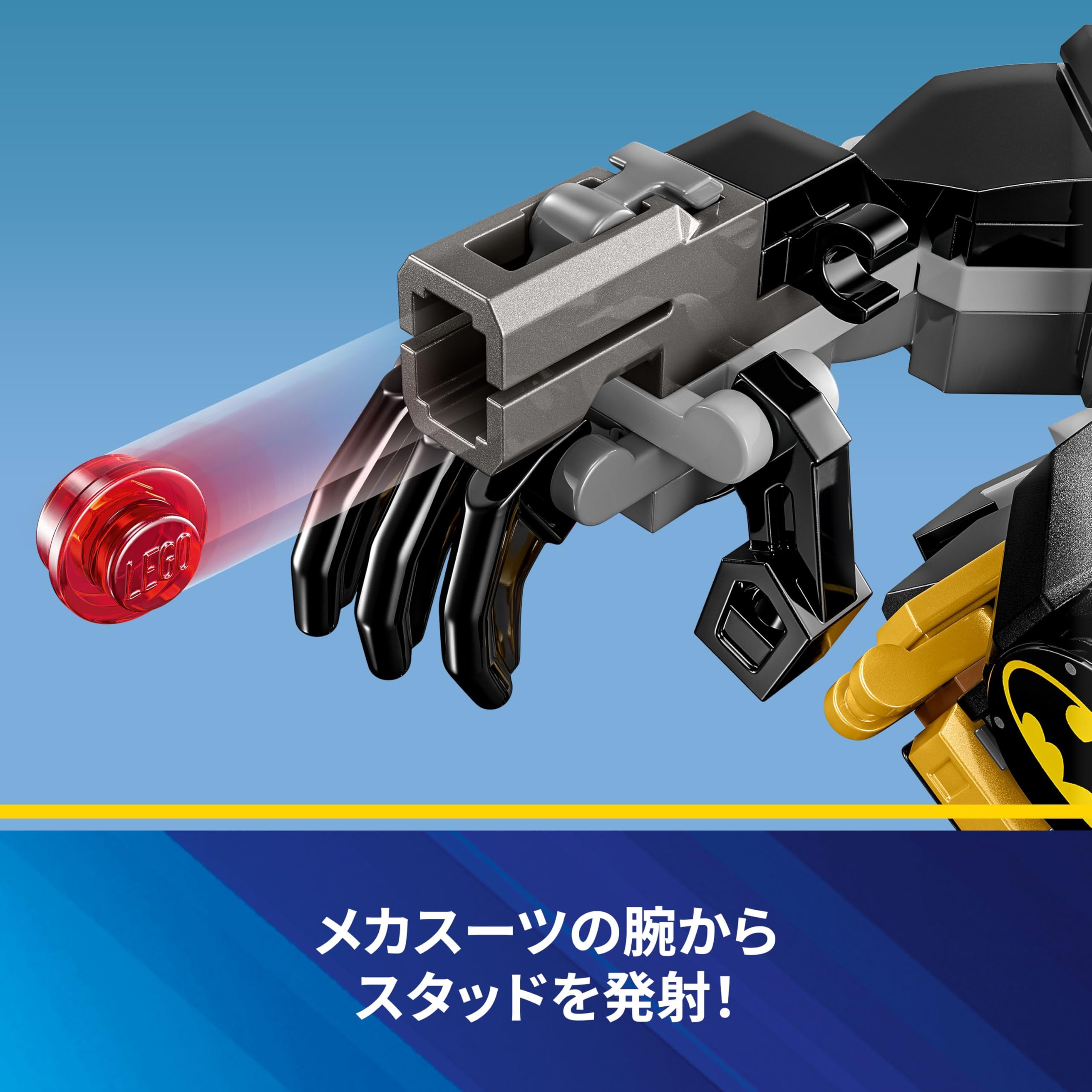 悪との戦いがさらにスケールアップ!バットマン メカスーツのコックピットにバットマンのミニフィギュアを乗せ、手足を振り回してヴィランたちをコテンパンにやっつけるぞ。巨大なバットラングやスタッドランチャー、ジェットパックで武装したメカスーツで空の彼方まで冒険に飛び出そう。