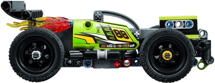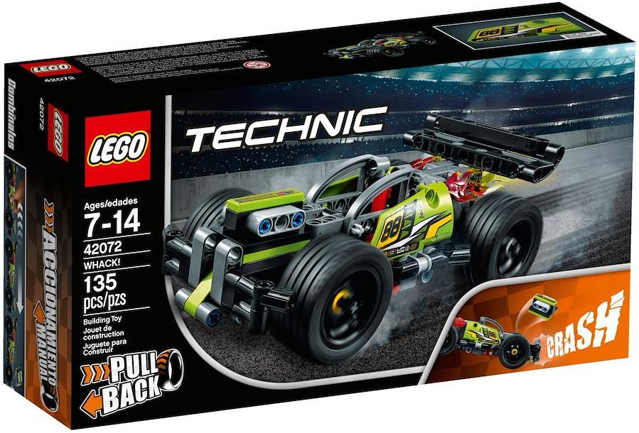 超高速のレゴ? テクニック激突レーサー!パワーをためてレースの準備だ。ライムグリーン、赤、灰色のボディにはレースカーらしいペイントのシールや頑丈なフロントバンパー、大きなスポイラーもついて、太い黒のリムが特徴的な薄型タイヤで道路をしっかりグリップするぞ。パワフルなプルバックモーターを巻いて、衝撃のパワーと加速を体感しよう。追突するとエンジンがボディから飛び出す!