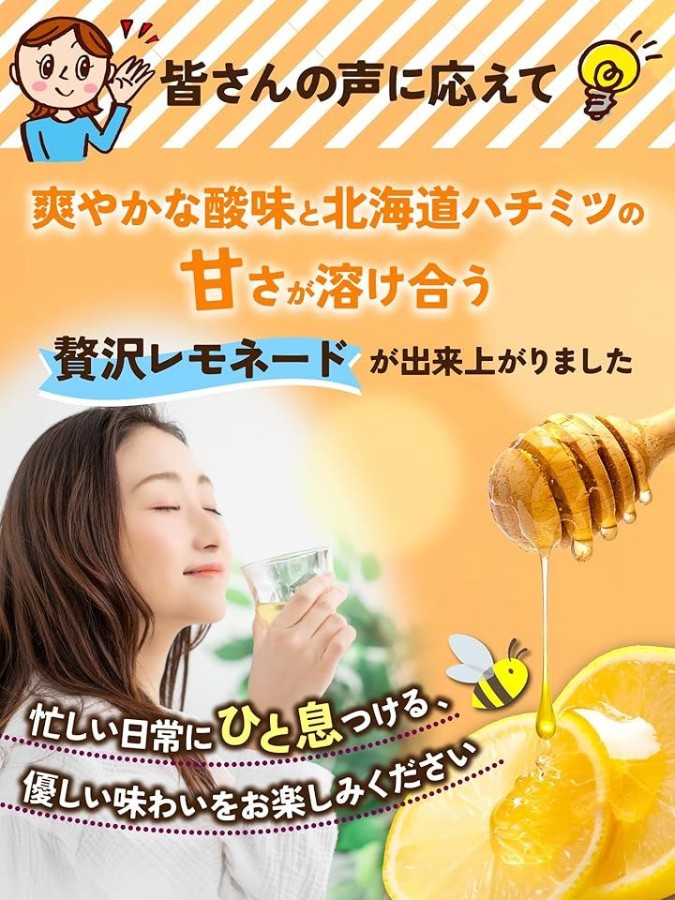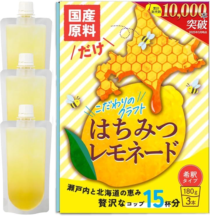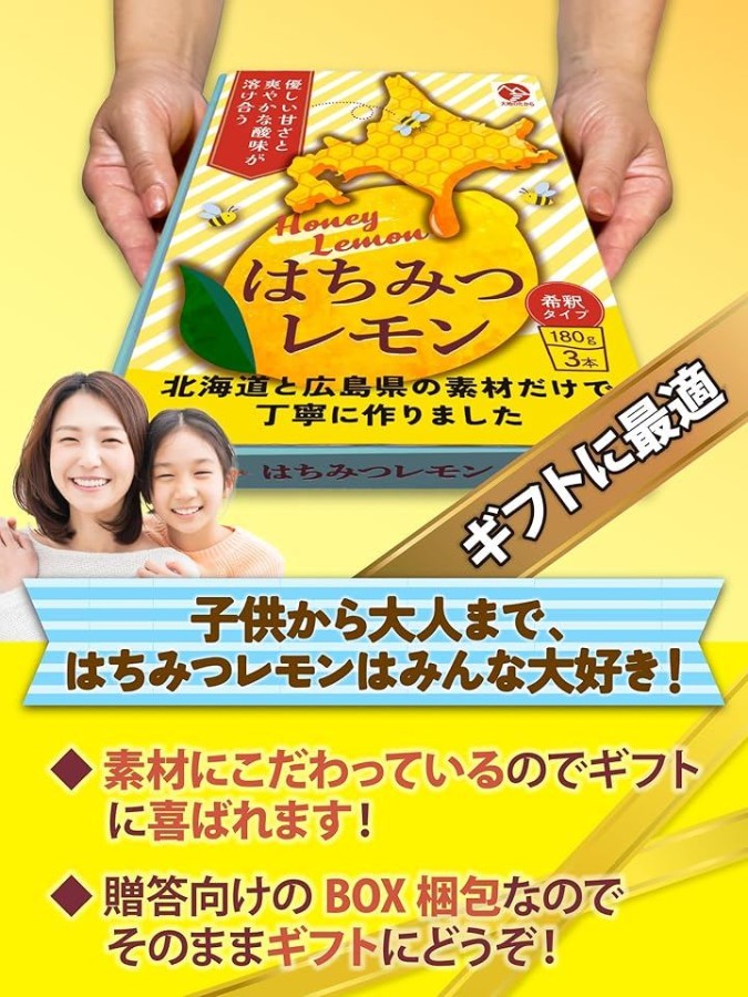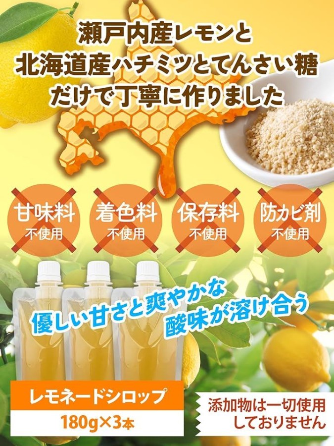 名称:シロップ原材料:レモン(広島県産)、甜菜糖(甜菜(北海道産))、はちみつ(北海道産)内容量:180gx3本賞味期限:パッケージに記載保存方法:直射日光を避け冷暗所にて保存してください。