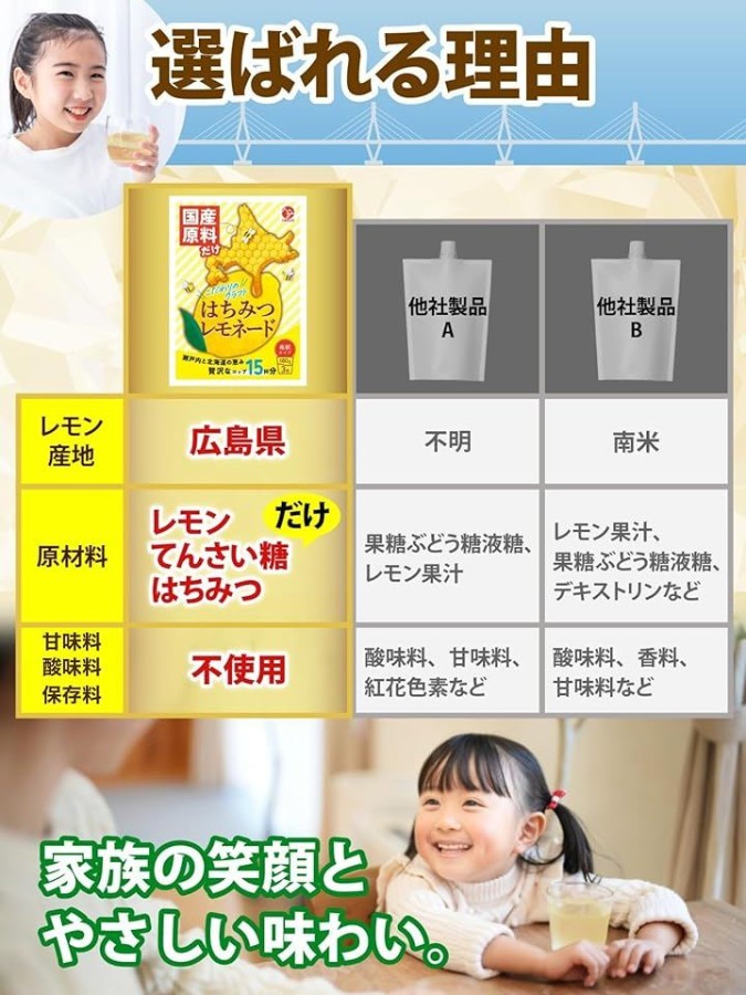 「国産 はちみつレモネード」防腐剤、WAX不使用の 瀬戸内産レモン と北海道ハチミツ てんさい糖だけで作った レモネードシロップ です。