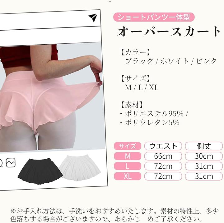 「商品内容」ショートパンツ一体型オーバースカート「カラー」ブラック / ホワイト / ピンク「サイズ」M / L / XL「寸法」M:ウエスト66cm / 側丈30cm、L:ウエスト72cm / 側丈31cm、XL:ウエスト72cm / 側丈31cm「素材」ポリエステル95% / ポリウレタン5% *お手入れ方法は、手洗いをおすすめいたします。