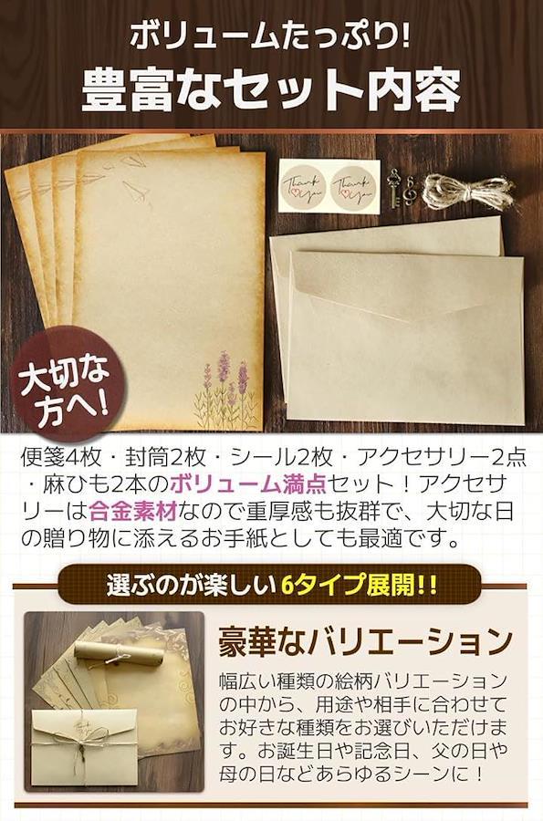 「豊富なセット内容」便箋4枚・封筒2枚・シール2枚・アクセサリー2点・麻ひも2本のボリューム満点セット。アクセサリーは合金素材なので重厚感も抜群で、大切な日の贈り物に添えるお手紙としても最適です。