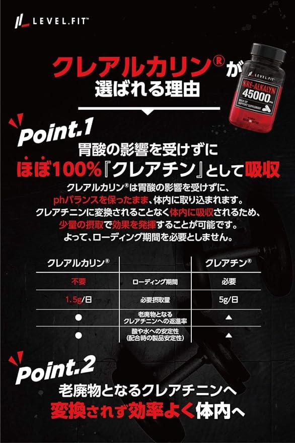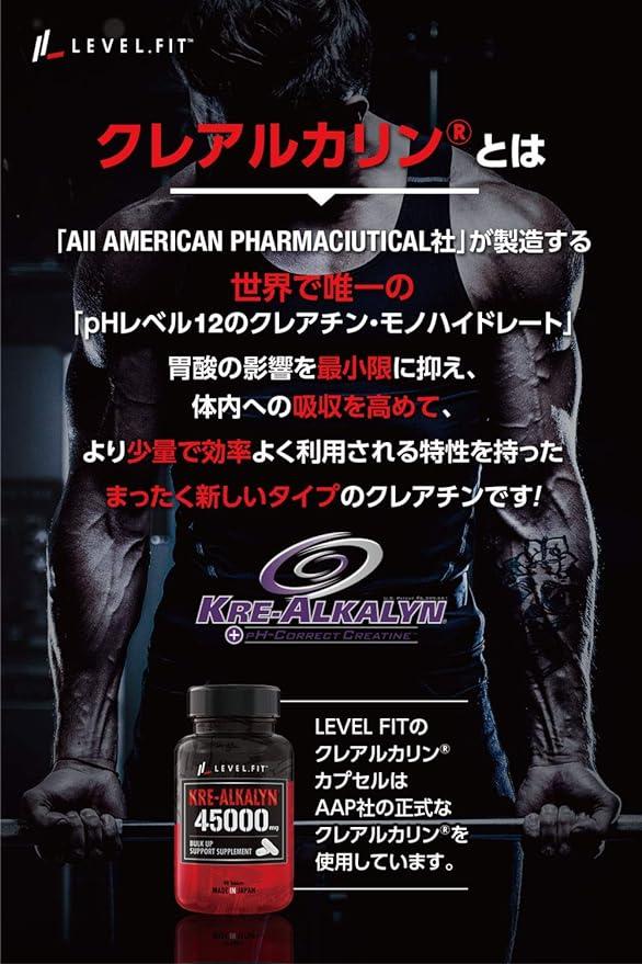 LEVEL FITクレアルカリンカプセルはスポーツマンやトレーニーはもちろんのこと健康を意識する人でも利用できるサプリメントです。クレアチンの持つ様々な問題点をクリアしたクレアルカリン(pH12クレアチンモノハイドレート)を45000mgも配合。プロのアスリートも安心してご利用いただけるようにBSCG(アンチドーピング認証済み) クレアルカリンはAAP社特許のクレアチンモノハイドレート。臨床試験にて持久力アップ、スタミナレベルアップ、筋力パフォーマンスアップした実績があります。 クレアチンはアルギニン・グリシン・メチオニンの3種類のアミノ酸から合成されるアミノ酸の1種です。 食事だけで必要な量を補給するのは困難でありサプリメントから素早く摂取することができます。 しかしクレアチンの摂取は、胃部不快や下痢などの症状を引き起こすこともありますが、クレアルカリンカプセルはその問題点をクリアしました。 pH12の安定したクレアチン分子が、少量で効率よく身体に吸収。クレアチニンに変換されることなく体内に吸収されるため、少量の摂取で効果を発揮することが可能でローディング期間が不要です。