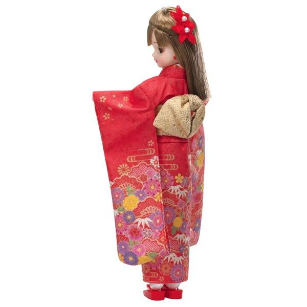 花尽くしの柄の赤い着物、髪型はハーフアップでお嬢様風に。