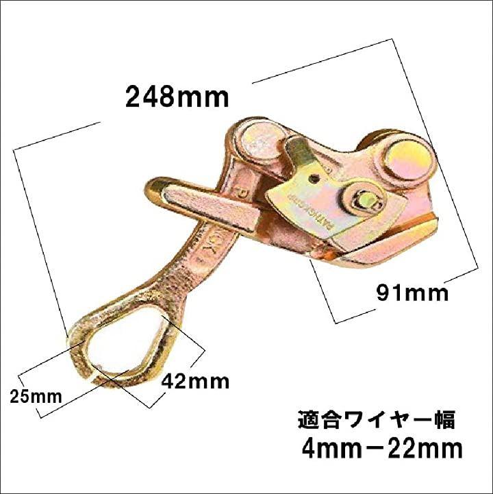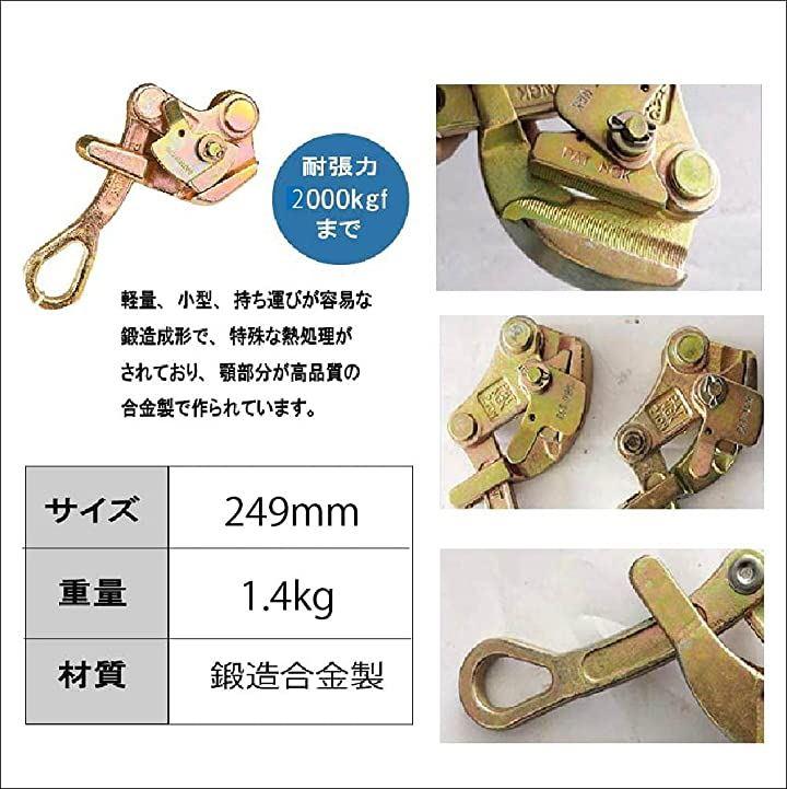 ・「仕様」 サイズ 249mm、重量 1.4kg、掴線範囲 4mm-22mm、適応線 番線 (針金) や鋼撚線 SDワイヤーなど、材質 鍛造合金製