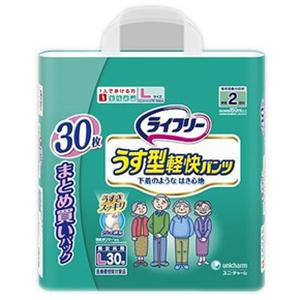 ■商品概要メーカー:ユニ・チャーム商品名:ライフリー うす型軽快パンツ Lサイズ(30枚)区分:日用雑貨内容量:30枚商品概要:新改良!スルッとはける機能●特許技術「スルッとゾーン」がウエストゴムの巻き込みを防止し、おしりに引っかからない。●「やわらかストレッチゾーン」で、軽い力で2倍に広がる。●「しっかりフィットゾーン」がズレを防ぐ。●スッキリうす型で、ごわごわしない。●うす型パワフル吸収体・横モレあんしんギャザーで、モレを防ぐ。●スッキリ形状で、足入れスムーズ。●やわらか素材でここちよい肌触り。●全面通気シートで、ムレずにサラサラ。●ニオイを閉じ込める、消臭ポリマー(*)配合。*アンモニアについての消臭効果があります。おしっこ約2回分(約300cc)を吸収します。JANコード:4903111541287商品コード:213803381