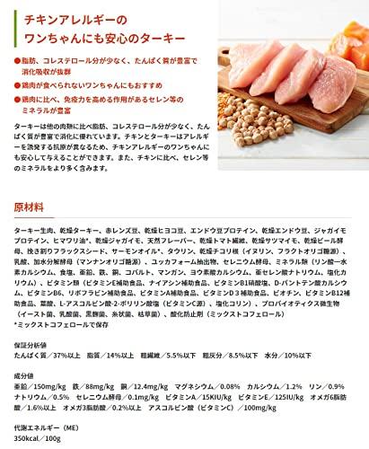 ターキー生肉、乾燥ターキー、赤レンズ豆、乾燥ヒヨコ豆、エンドウ豆プロテイン、乾燥エンドウ豆、ジャガイモプロテイン、ヒマワリ油*、乾燥ジャガイモ、天然フレーバー、乾燥トマト繊維、乾燥サツマイモ、乾燥ビール酵母、挽き割りフラックスシード、サーモンオイル*、塩化カリウム、タウリン、乾燥チコリ根(イヌリン、フラクトオリゴ糖源)、乳酸、加水分解酵母(マンナンオリゴ糖源)、ユッカフォーム抽出物、ミネラル類(リン酸一水素カルシウム、食塩、プロテイネイテッド亜鉛、プロテイネイテッド鉄、セレニウム酵母、プロテイネイテッド銅、プロテイネイテッドマンガン)、ビタミン類(ビタミンE補助食品、ナイアシン補助食品、ビタミンB1硝酸塩、D-パントテン酸カルシウム、ビタミンB6、リボフラビン補助食品、ビタミンA補助食品、ビタミンD3補助食品、ビオチン、ビタミンB12補助食品、葉酸、L-アスコルビン酸-2-ポリリン酸塩(ビタミンC源)、塩化コリン)、プロバイオティクス微生物(イースト菌、乳酸菌、黒麹菌、糸状菌、枯草菌)、酸化防止剤(ミックス