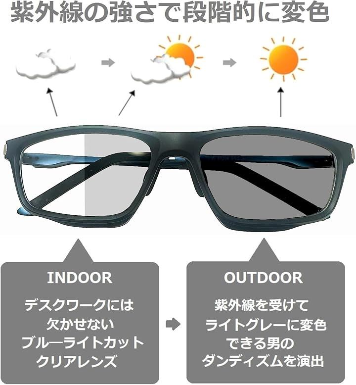 「ビジネス/戸外の2WAY使用」パソコンでのお仕事には欠かせないブル―ライトカットと外出時に太陽光を受けると変色する調光機能を備えた2WAY仕様のレンズを搭載しています。