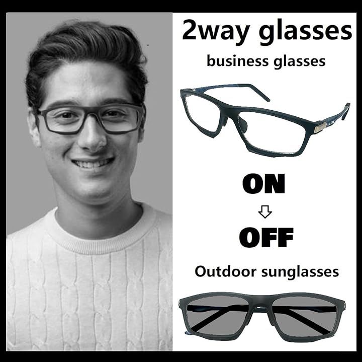 Light-adjustable, color-changing, blue light-blocking glasses for business and PC work, transforming into sunglasses for everyday wear. Lightweight, UV400 protection, aluminum-magnesium arms.