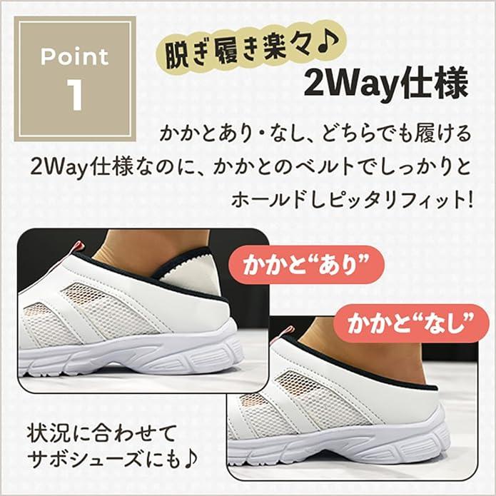 【脱ぎ履き楽々♪2Way仕様】かかとあり・なし、どちらでも履ける2Way仕様なのに、かかとのベルトでしっかりとホールドしピッタリフィット!状況に合わせてサボシュースとして履くことも可能です。
