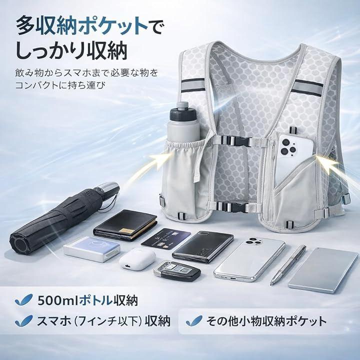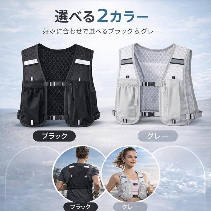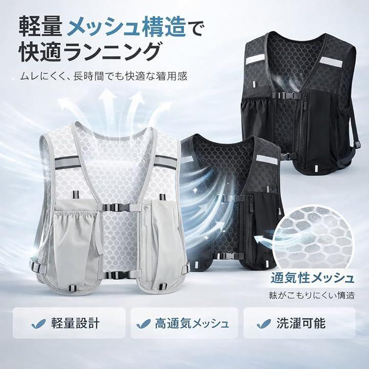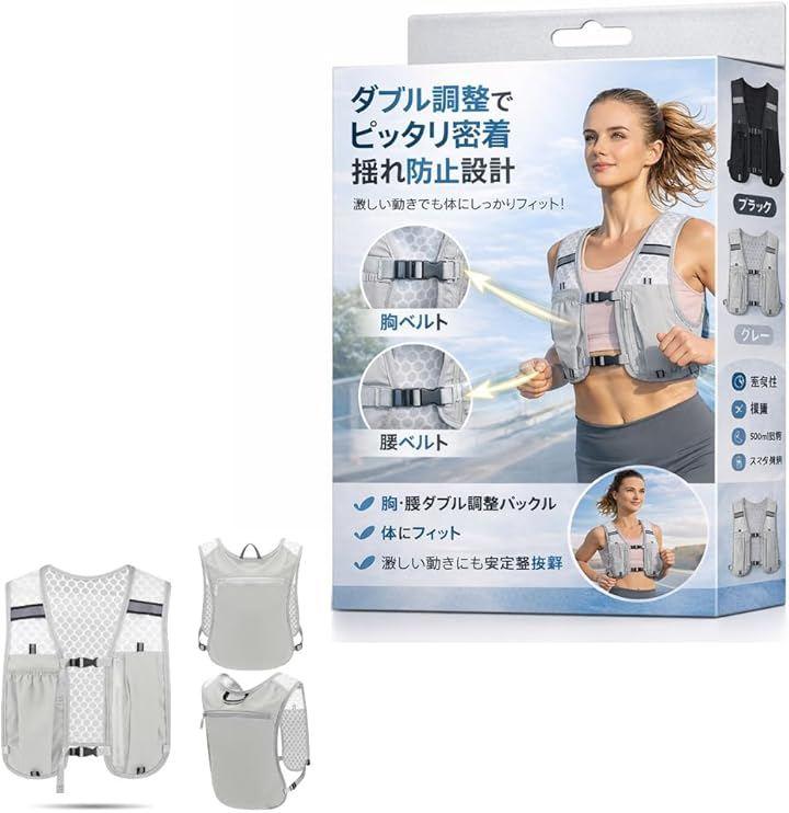 ベスト型構造と調整機能の組み合わせにより、快適性と安定性を両立したランニングベストとして設計されています。
