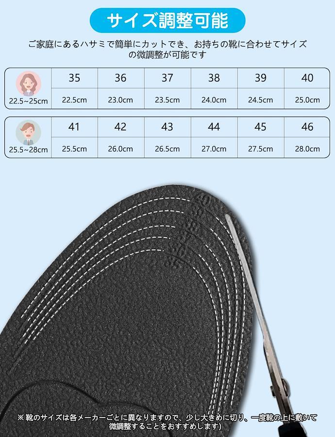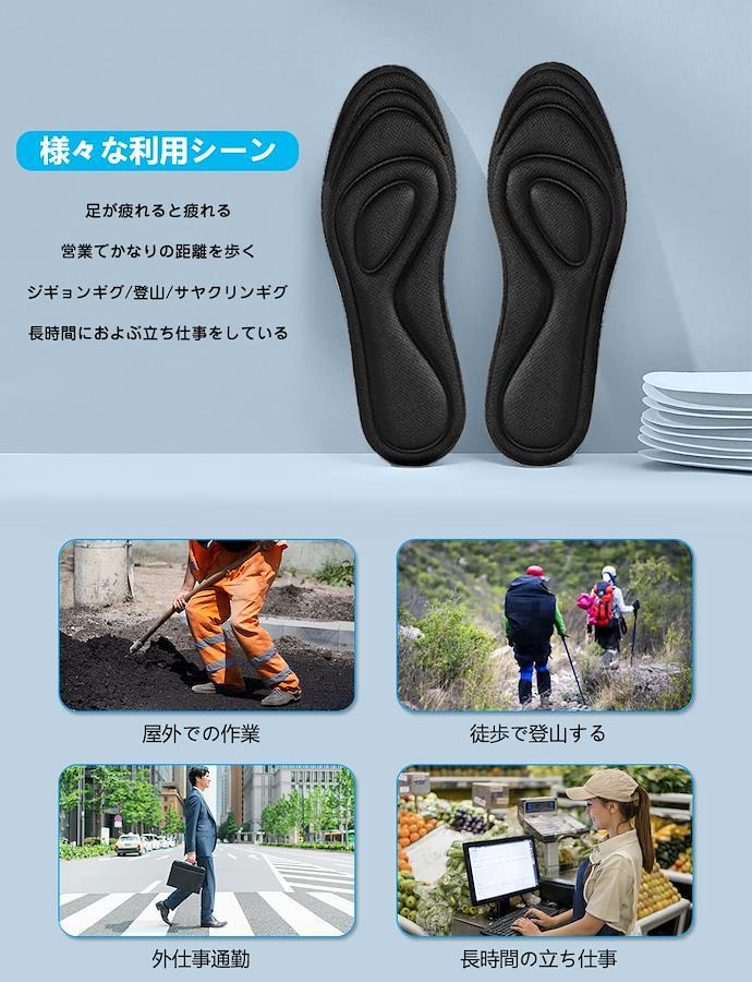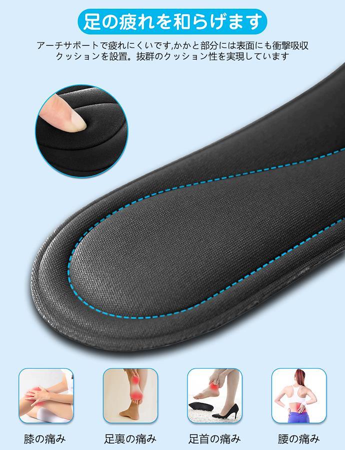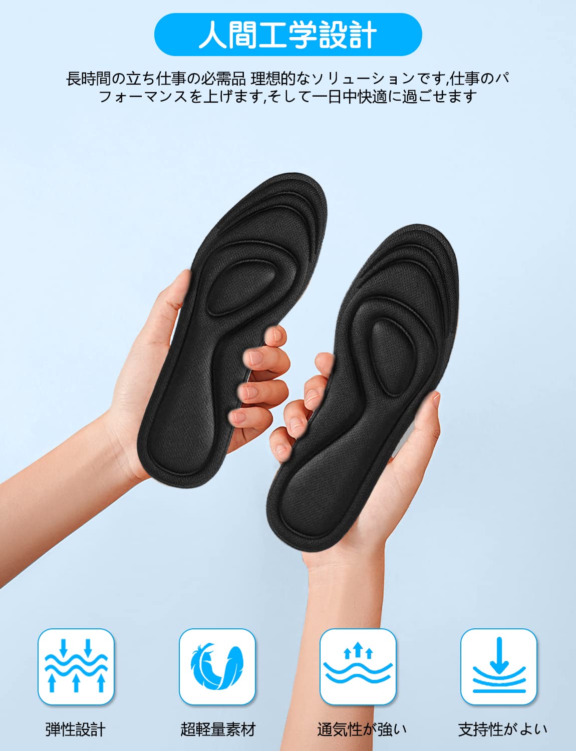 【柔軟性】柔らかい材質で作成したインソールで、アーチの部分柔軟性が豊富で、動きより複雑な変化に対応できるフレキシブルな機能が持ち、適度な弾力で足にフィットすることで快適差が増えます。 【通気が良い】蒸れを防ぐ通気口を多数設置することで、通気性がアップし、防臭効果にも見込めます。長時間履いても蒸れにくくて、高い通気性で速乾性を実現されます。 【立体型 インソール】立体構造の中足骨と土ふまずパッドが縦・横アーチをしっかり整えて 疲れにくく気持ちの良い理想的な歩行をサポートします。足をしっかりサポートして長時間歩いても疲れにくい履き心地を追求しました。 【サイズ調整可能】M:22.5cm~25cm/欧標サイズ35-40対応、L:25~28.5cm/欧標サイズ40-46対応。ハサミで簡単にカットでき、お持ちの靴に合わせてサイズの微調整が可能です。 【この時使います】立ち仕事 、ウォーキング、ランニング テニス、ゴルフ、バレーボール、ガスケットボールなどのスポーツ、またアウトドアなど様々な場合に使われ、靴に合わない方にはお勧めします。