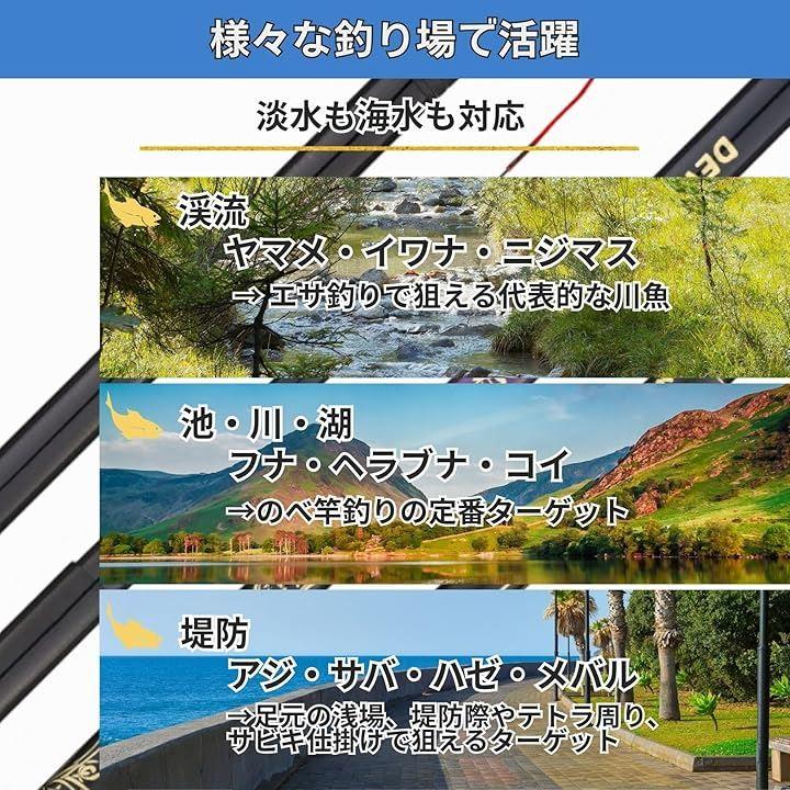 「淡水・海水どちらでも活躍」川や湖でのフナ、タナゴ、オイカワ、渓流でのヤマメ、アマゴ、管理釣り場でのニジマスやヘラブナ釣りなど淡水に適しています。