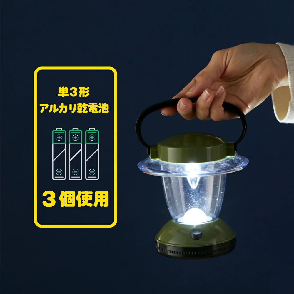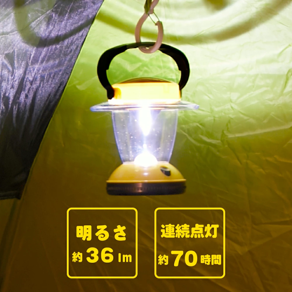 【商品名/型番】軽量LEDランタンライト イエロー ALA-3303YE/ 4962644215584軽量LEDランタンライト グリーン ALA-3303GN/ 4962644215607【商品サイズ】約Ф120×170mm(ハンドルを立てた状態)/約166g【材質】本体/ABS樹脂、レンズ/PS樹脂【商品情報】単3形アルカリ乾電池3個使用の軽量・小型LEDランタンライト連続点灯 約70時間(国内メーカー製単3形アルカリ乾電池使用時)明るさ 約36ルーメン緊急時・災害時用に・アウトドアにも