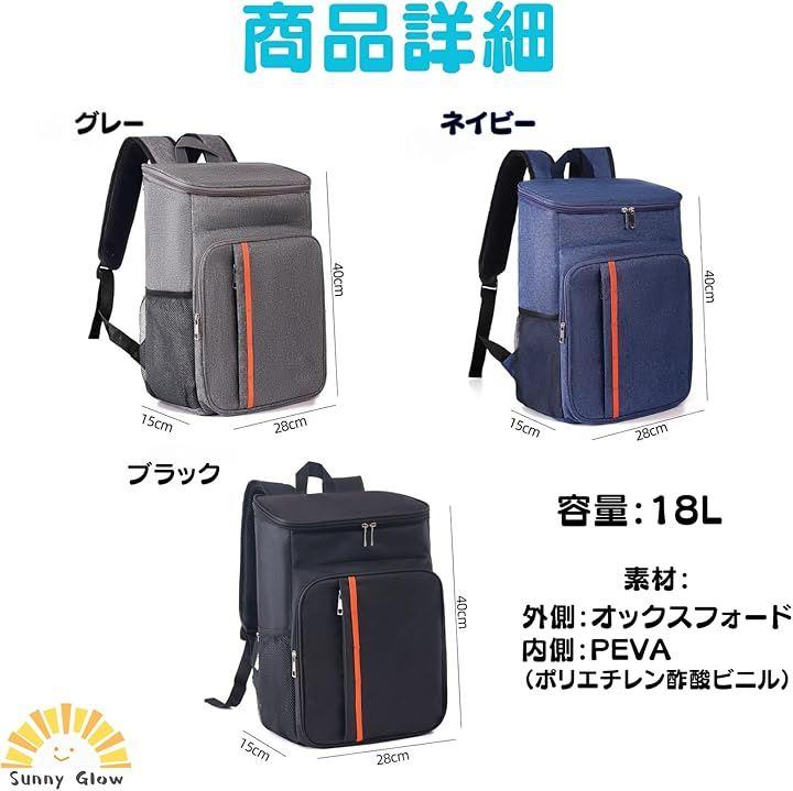 「商品詳細」サイズ:40x28x15cm、容量:18L、素材:外側:オックスフォード/内側:PEVA(ポリエチレン酢酸ビニル)