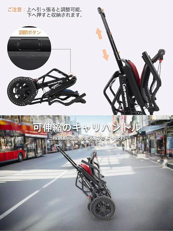 折りたたみ後、車椅子のキャリハンドルは自由に長さを調節できるため、保管や旅行に便利です。