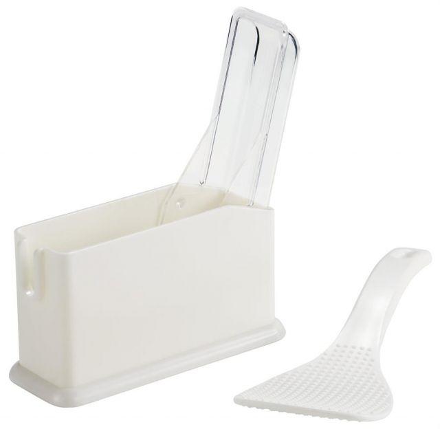 ホコリがつかないカバー付のしゃもじホルダー。カバーはしゃもじを置くだけで勝手に閉まる親切設計で、家事の手を煩わせない。