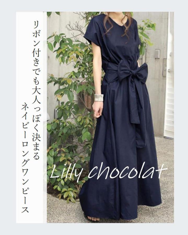 ゆるっとしたシルエットと大きめリボンが大人かわいいロングワンピースになります。
