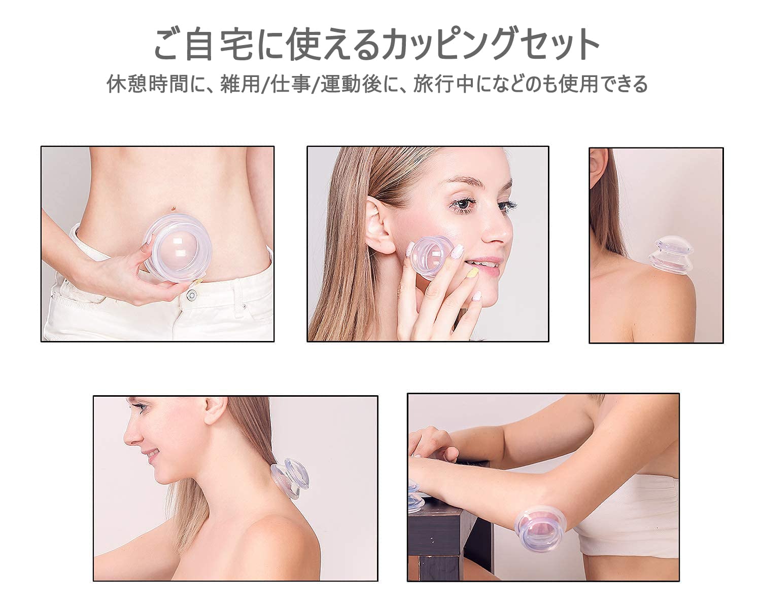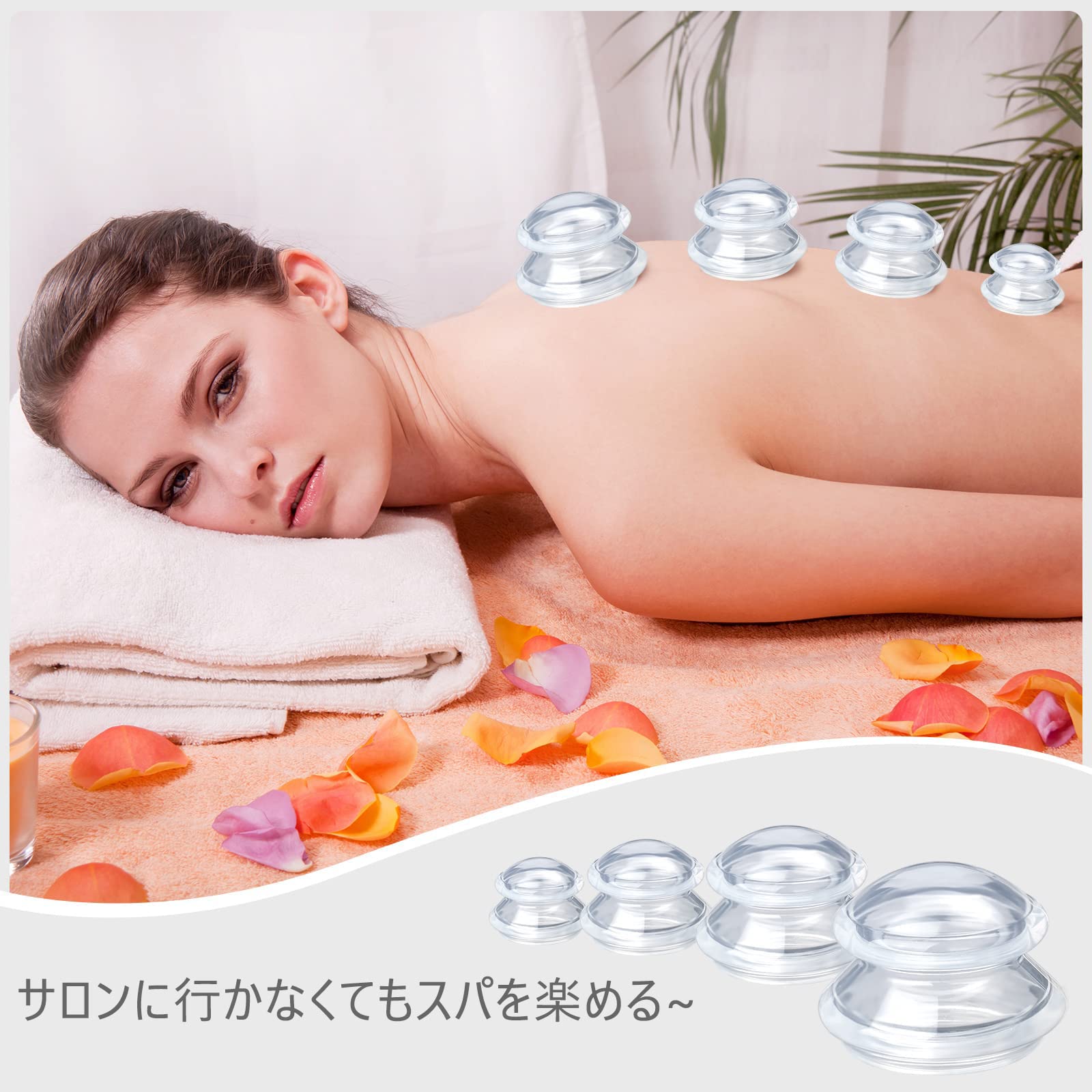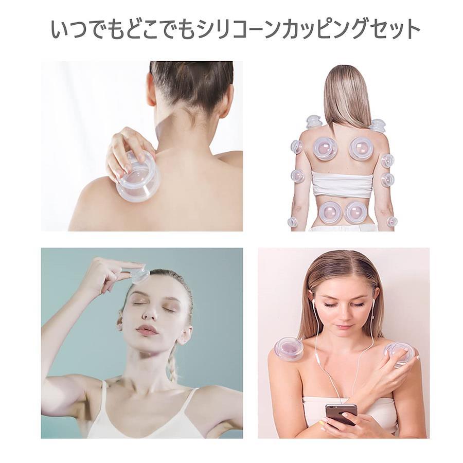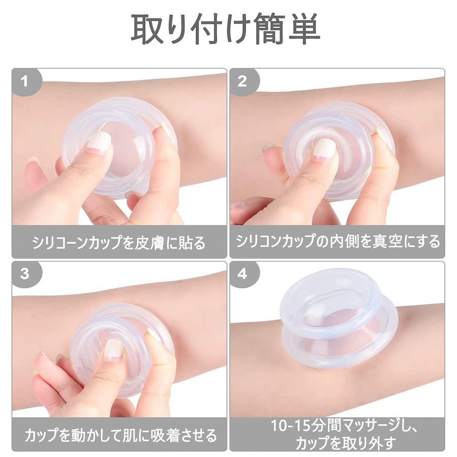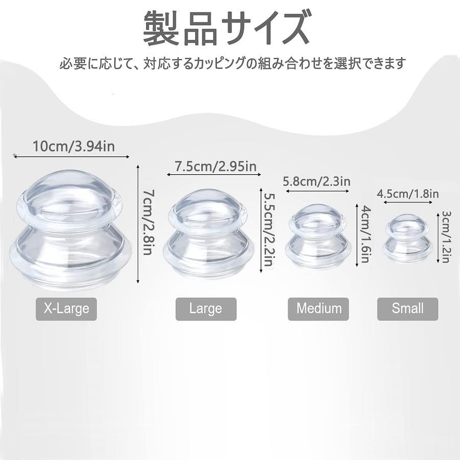 ??【ご自宅に使えるカッピングセット】吸引作業をする専用器具もいらず、押すだけで簡単に吸引でき、体に気になるところでご使用頂けます。ご自宅にあるポーチやカゴにポイッと片付けるだけで使用後の面倒な作業もいりません。 ??【材質優れたシリコン製】シリコーン素材を採用し、軽くて持ちやすいです。カッピングに高温抵抗があり、酸およびアルカリがあります。透明度が高いので、皮が変わる後缶で観察することができます。また老化が容易ではなく、黄変しにくいです。 ??【4サイズを用意・お手入れ簡単】「XL」:直径10.5×高さ7cm/重量:約50g ;「L」:直径7.5×高さ5.5cm/重量:約30g ;「M」:直径6×高さ4.5cm/重量:約10g;「S」:直径4.7×高さ3.5cm/重量:約4g。必要に応じて、対応するカッピングの組み合わせを選択できます。お手入れが簡単で、水洗いで新品のようにきれいになりますよ。 ??【使用方法・適用場合】カッピングを押し当て、上の平の部分を押し込むと吸い付きます。外す時も同様に押し込んでください。温泉、サウナなどでご使用頂くとより良い効果が期待できます。休憩時間に、雑用/仕事/運動後に、旅行中になどのも使用できます。更にオフィスで働く人々のための素晴らしい贈り物です。 ??【カスタマーサービス】購入日から360日保証します。保証期間に返金又は交換は可能です。【連絡先】本製品をご使用になる前に、必ず取扱説明書をお読みください。何か不明がありましたら、アカウントサービス内の「アカウントサービス」→「注文履歴」→「販売元」→「質問する」或いは店舗情報に記載されている他の連絡先から、お気軽にお問合せ下さい。